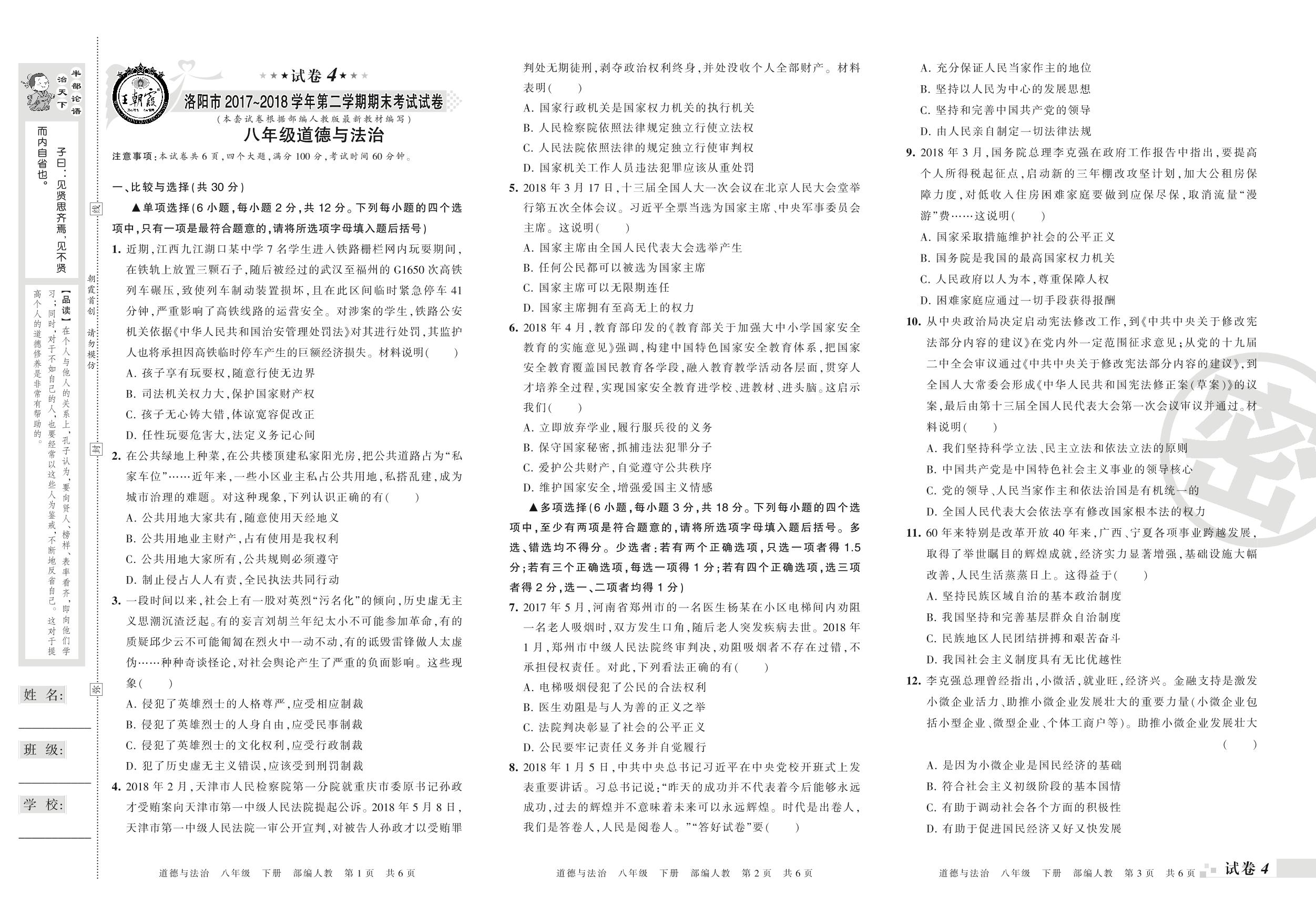 2017-2018学年第二学期洛阳市八年级道德与法治试卷(人教版)【4】