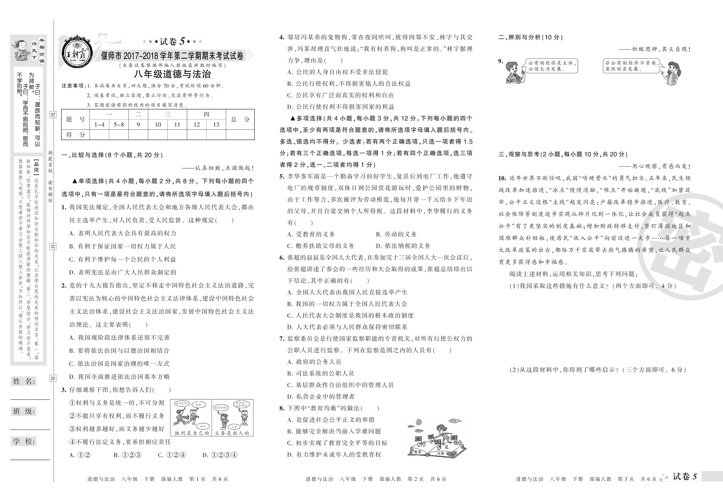 2017-2018学年第二学期偃师市八年级道德与法治试卷(人教版)【5】
