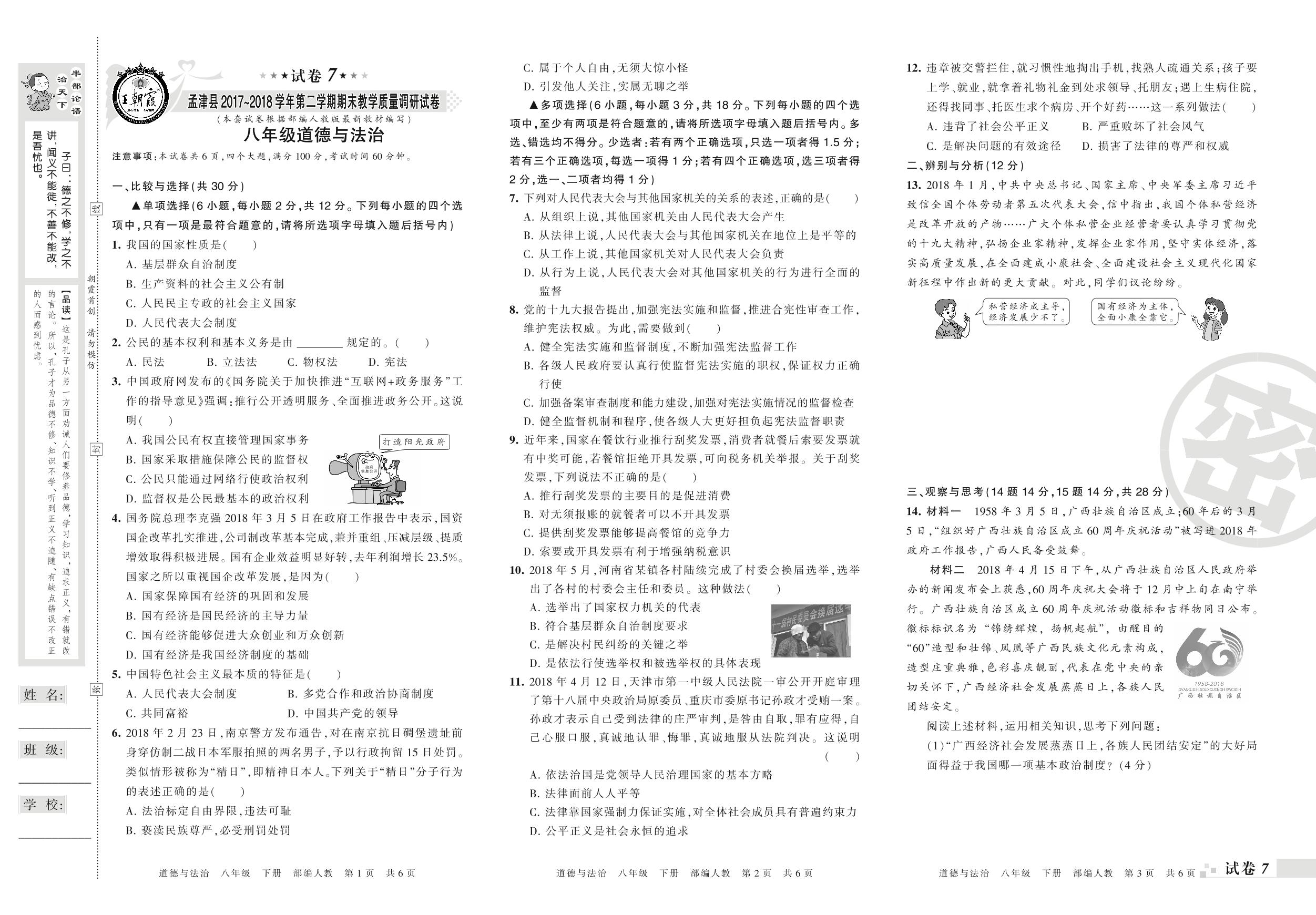 2017-2018学年第二学期洛阳市孟津县八年级道德与法治试卷(人教版)【7】