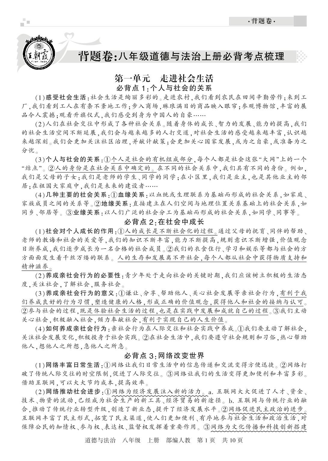 王朝霞期末背题卷——必背考点梳理八年级上册道德与法治(人教版)【0】