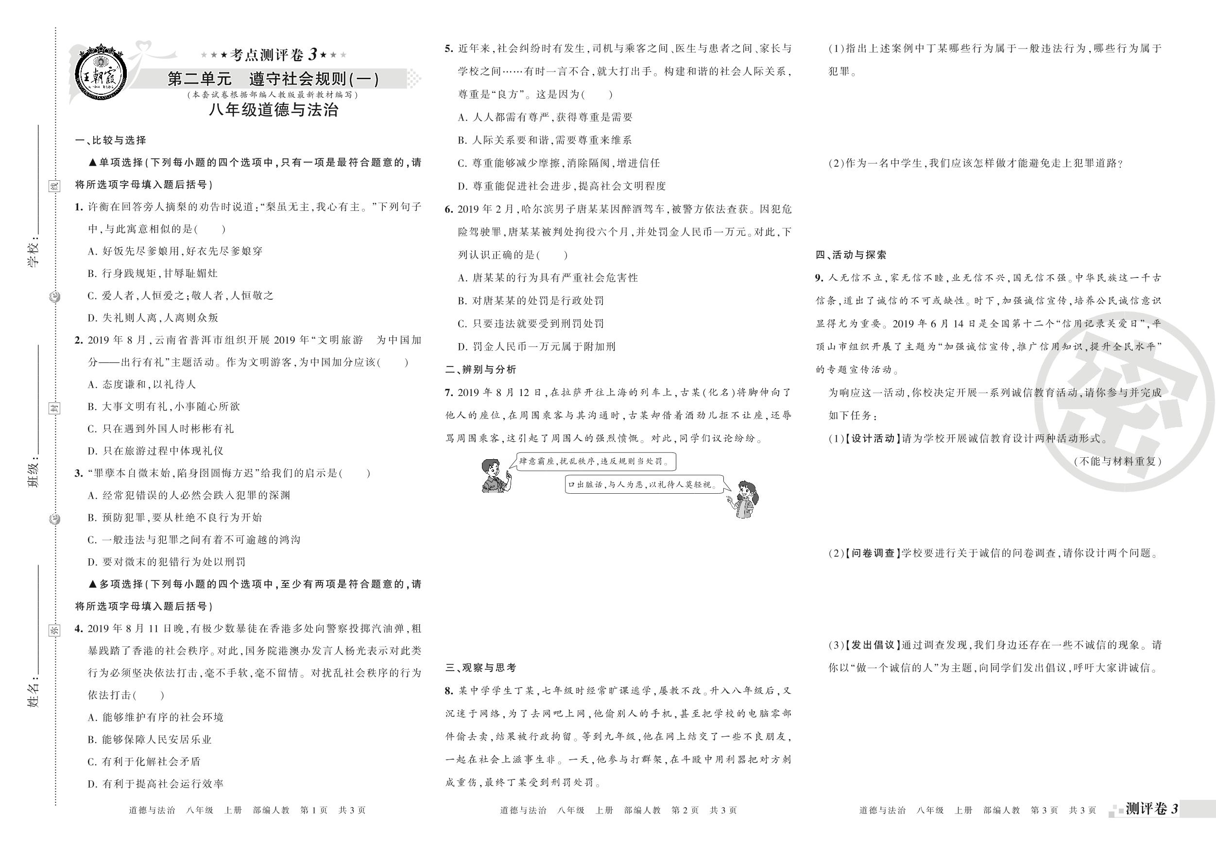 王朝霞期末测评卷——第二单元 遵守社会规则八年级上册道德与法治(人教版)【0】