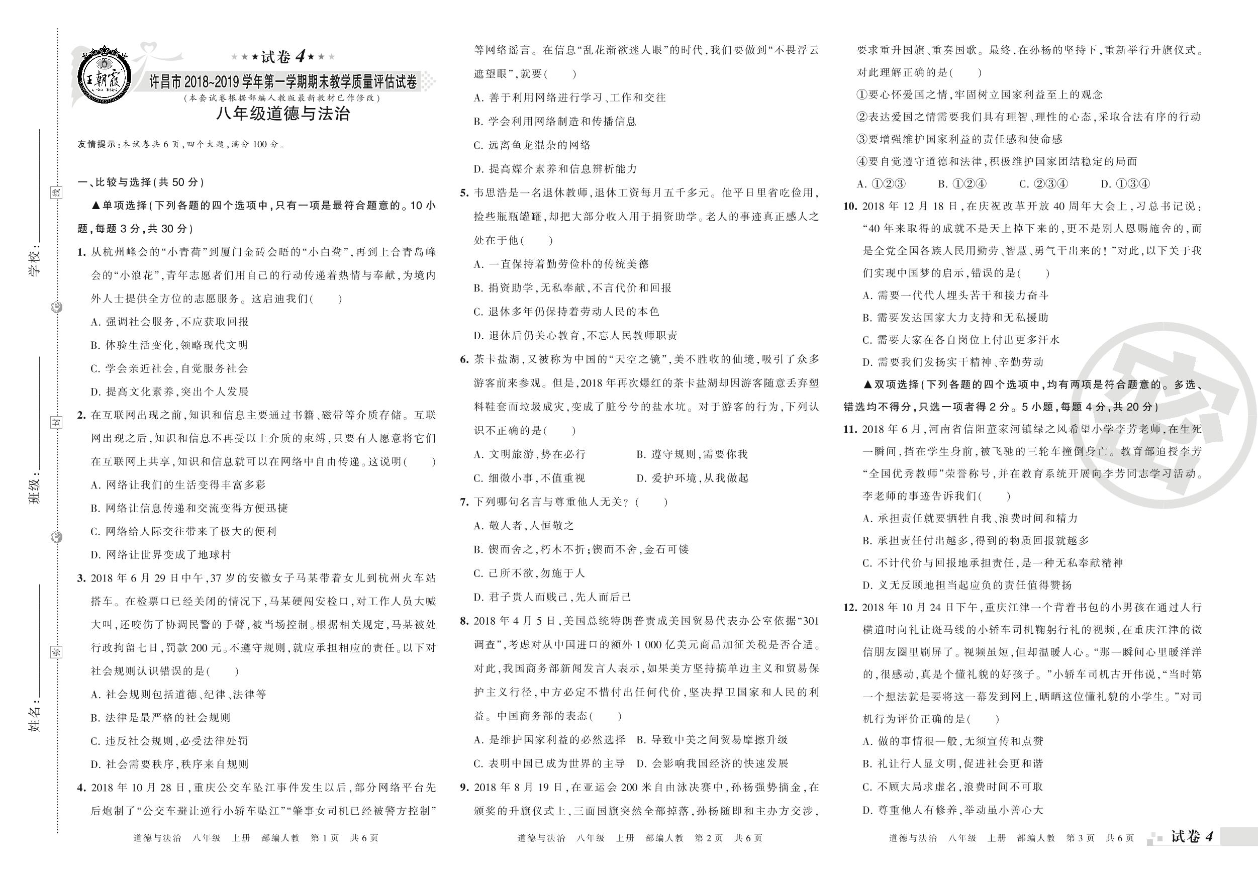 2018-2019学年第一学期许昌市八年级道德与法治试卷(人教版)【4】