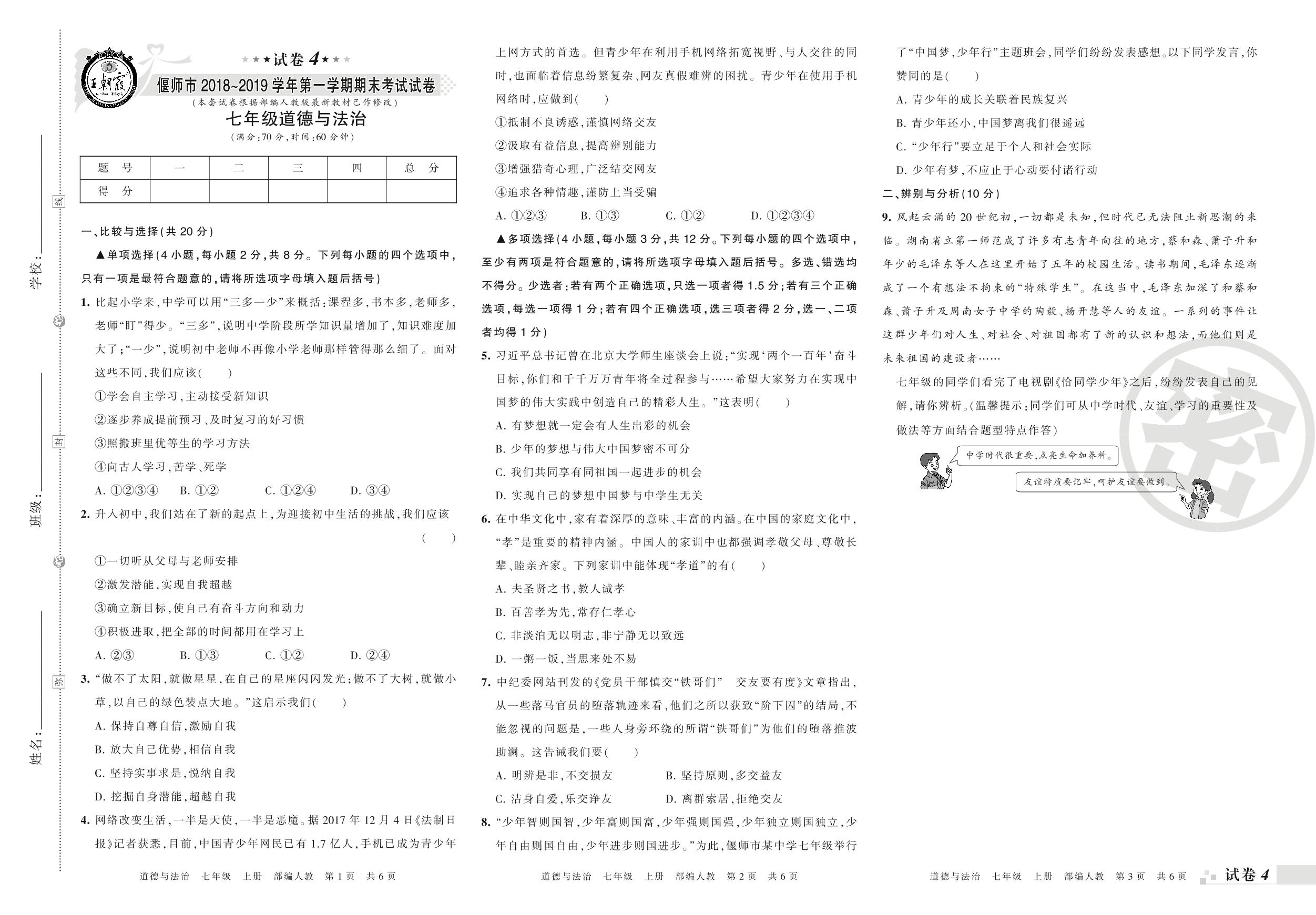 2018-2019学年第一学期偃师市七年级道德与法治试卷(人教版)【4】