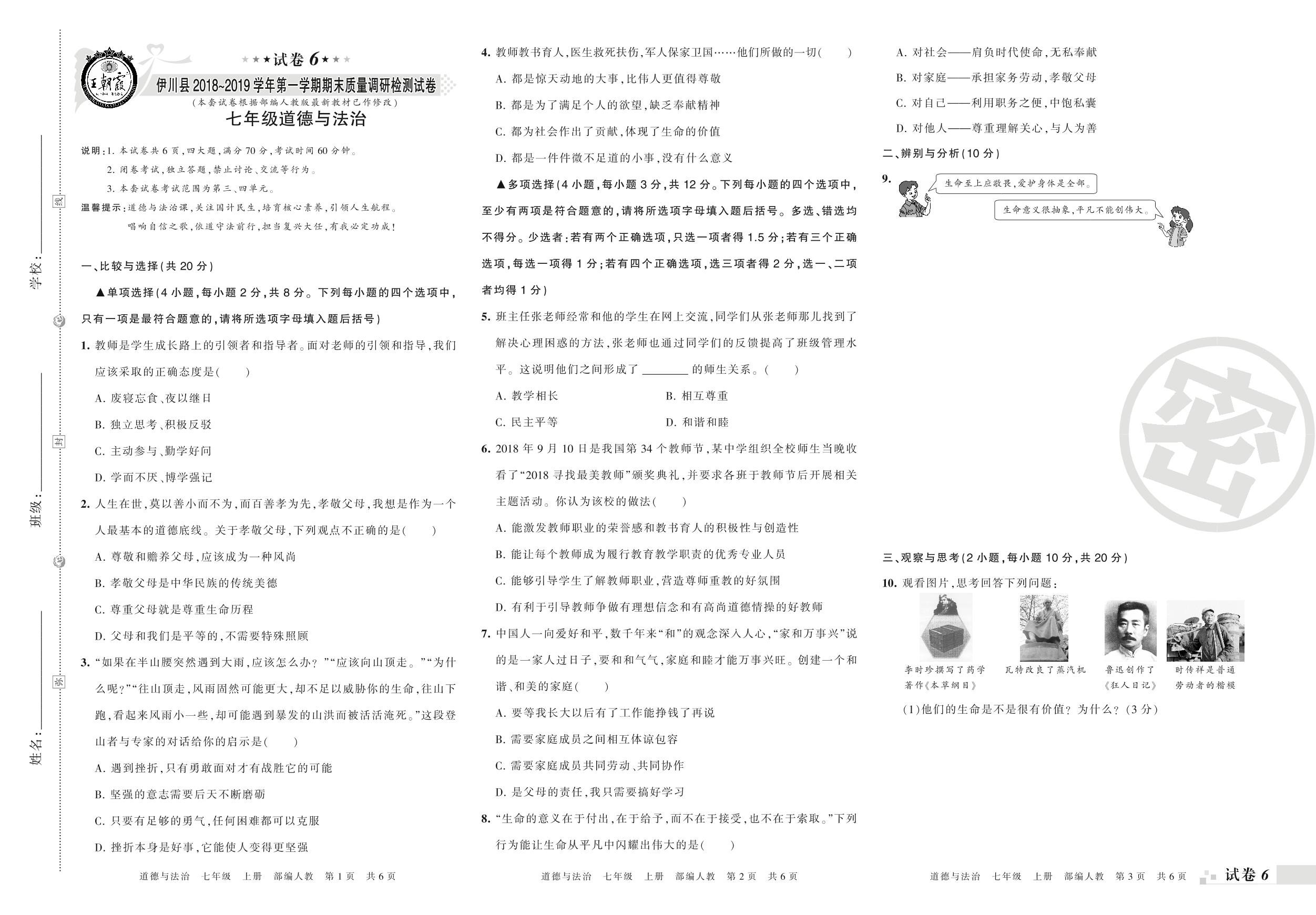 2018-2019学年第一学期洛阳市伊川县七年级道德与法治试卷(人教版)【6】