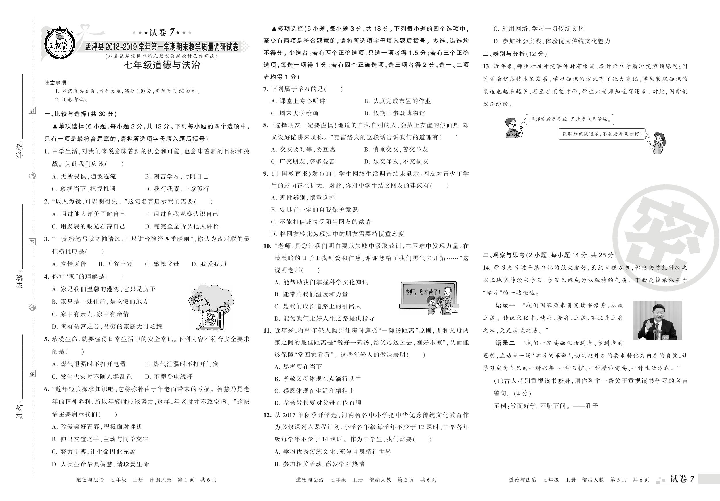 2018-2019学年第一学期洛阳市孟津县七年级道德与法治试卷(人教版)【7】