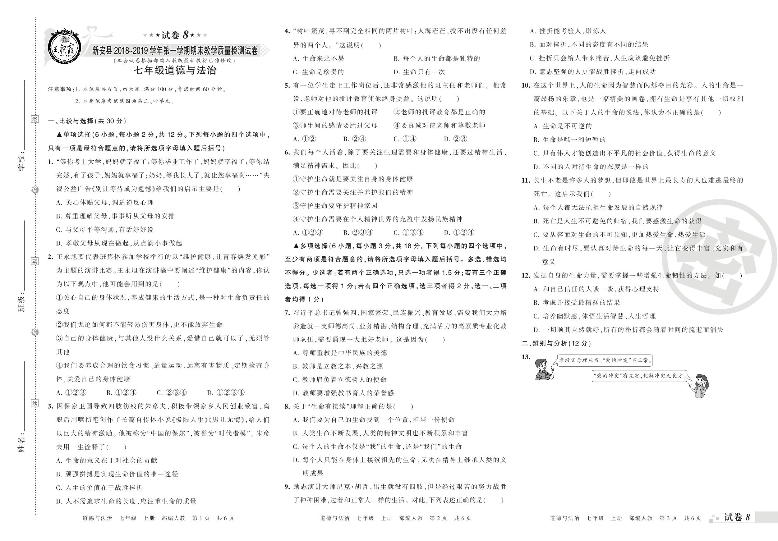2018-2019学年第一学期洛阳市新安县七年级道德与法治试卷(人教版)【8】