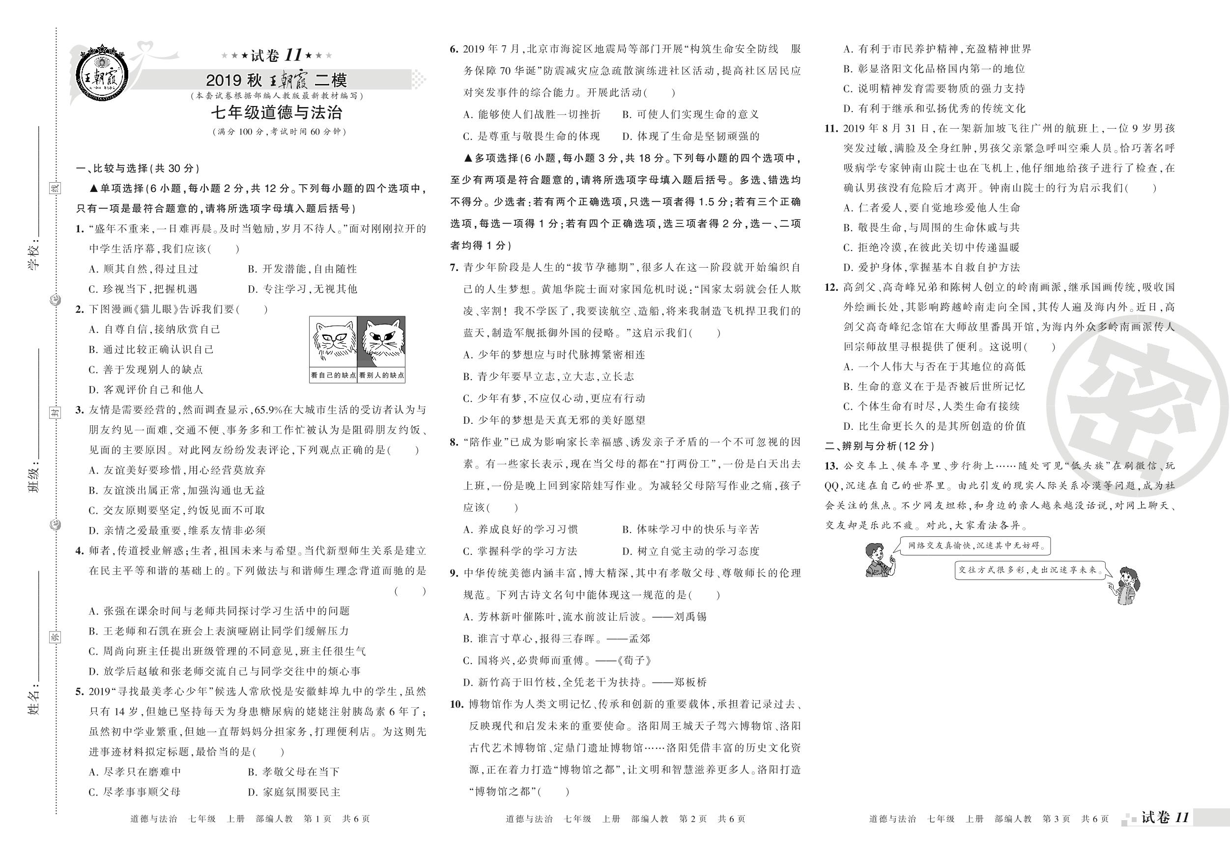 王朝霞期末模拟卷七年级上册道德与法治(人教版)_R210812143701【11】