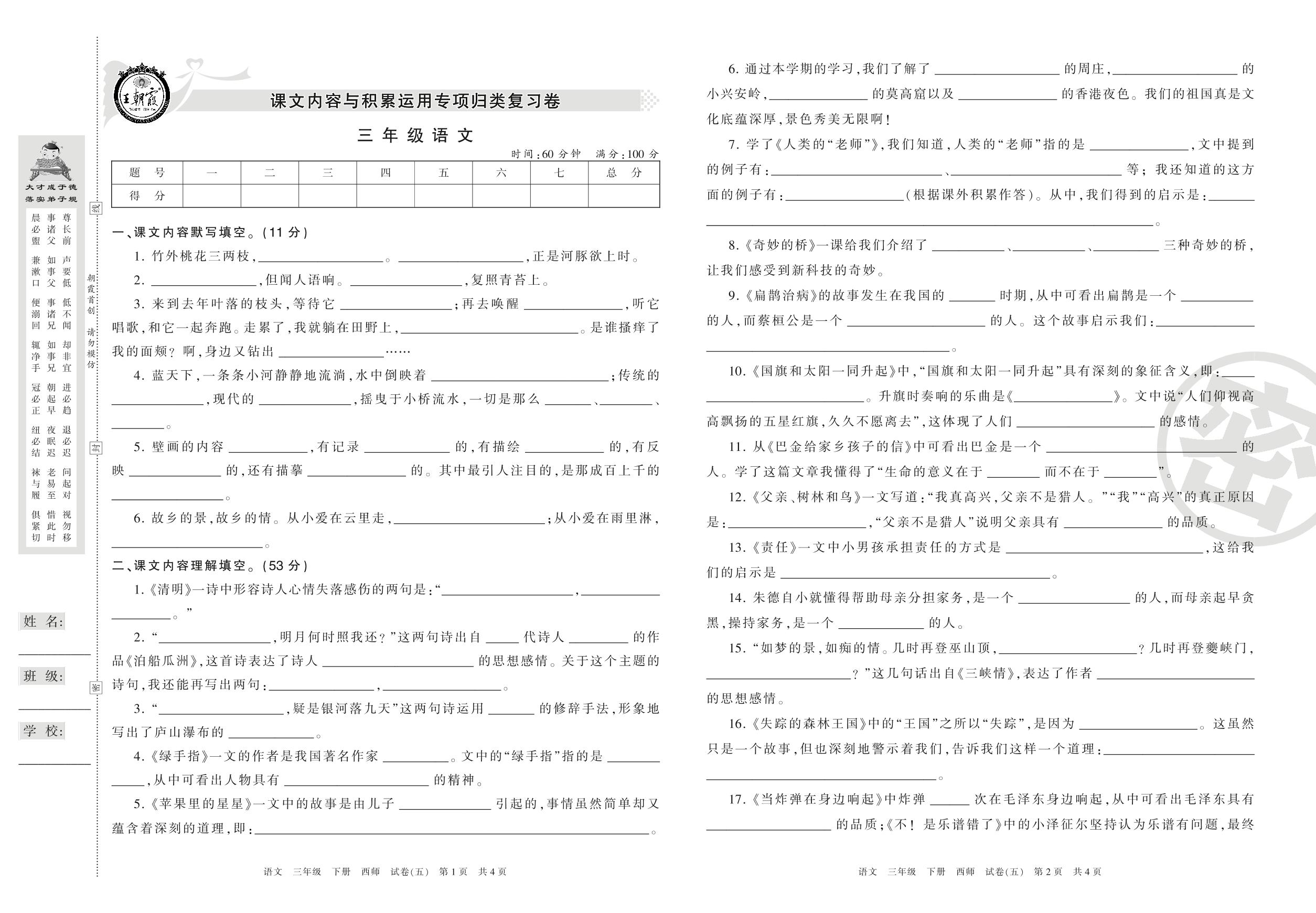 王朝霞期末专项卷三年级下册语文(西师版)_R21080195413【5】