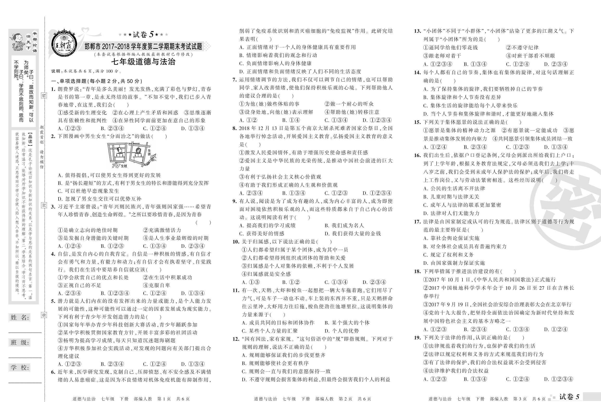 2017-2018学年第二学期邯郸市七年级道德与法治试卷(人教版)【5】