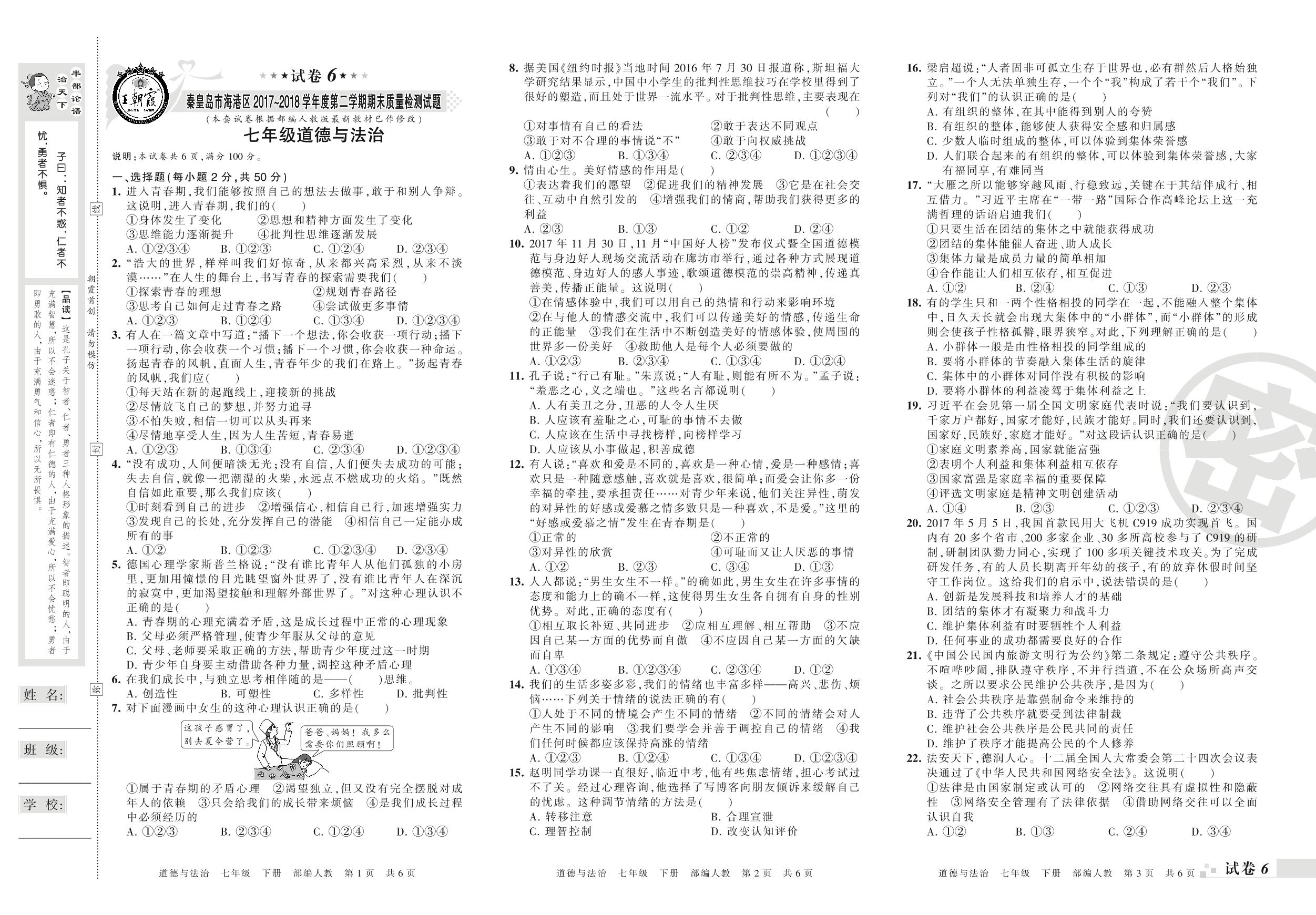 2017-2018学年第二学期秦皇岛市海港区七年级道德与法治试卷(人教版)【6】