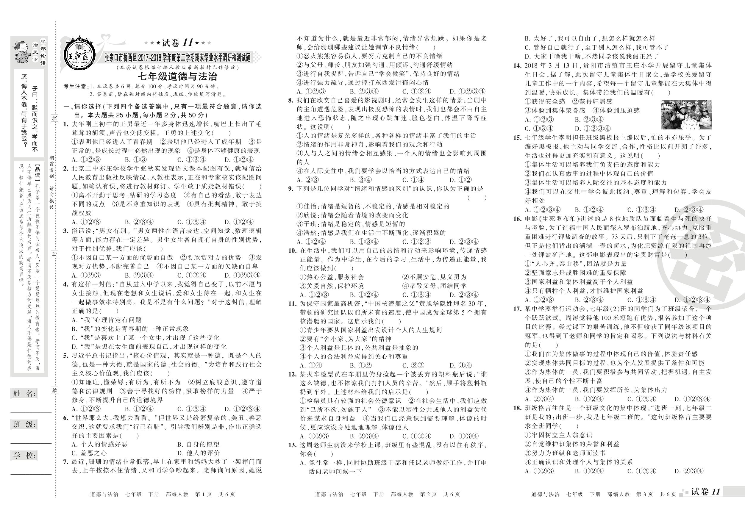 2017-2018学年第二学期张家口市桥西区七年级道德与法治试卷(人教版)【11】