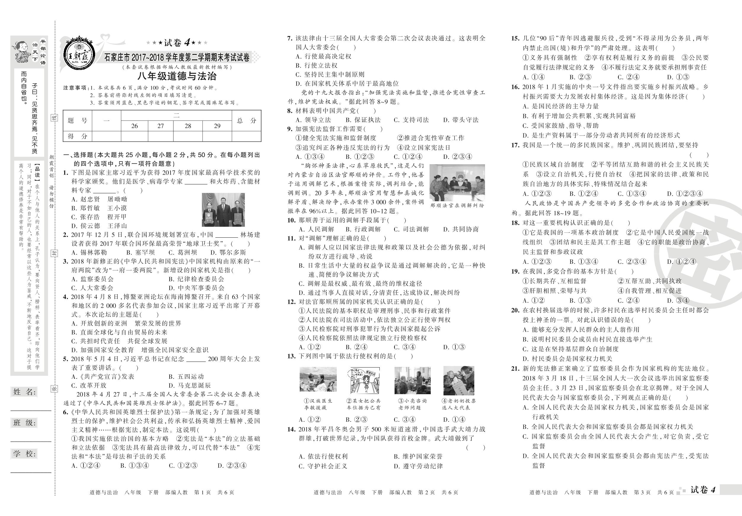 2017-2018学年第二学期石家庄市八年级道德与法治试卷(人教版)【4】