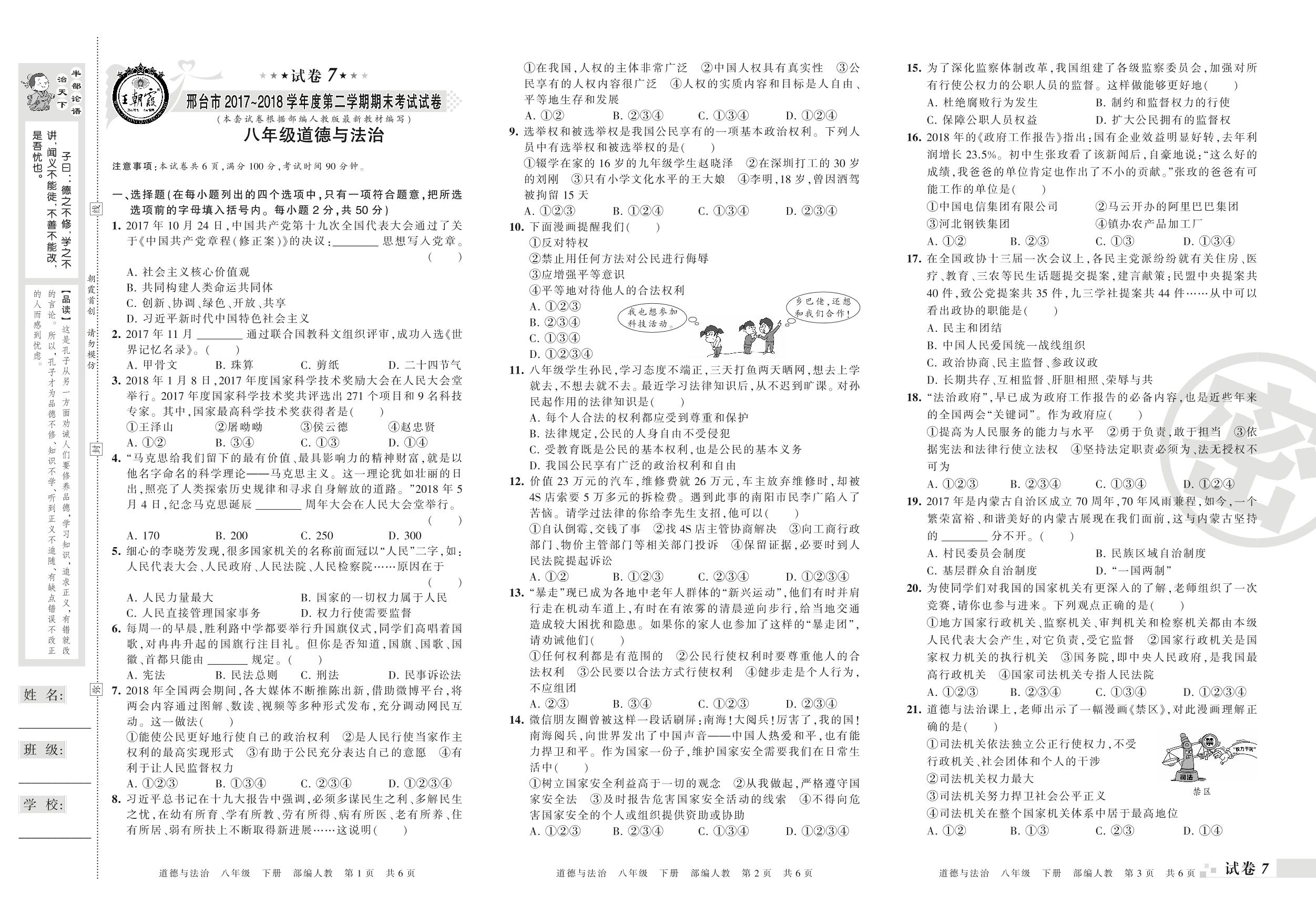 2017-2018学年第二学期邢台市八年级道德与法治试卷(人教版)【7】