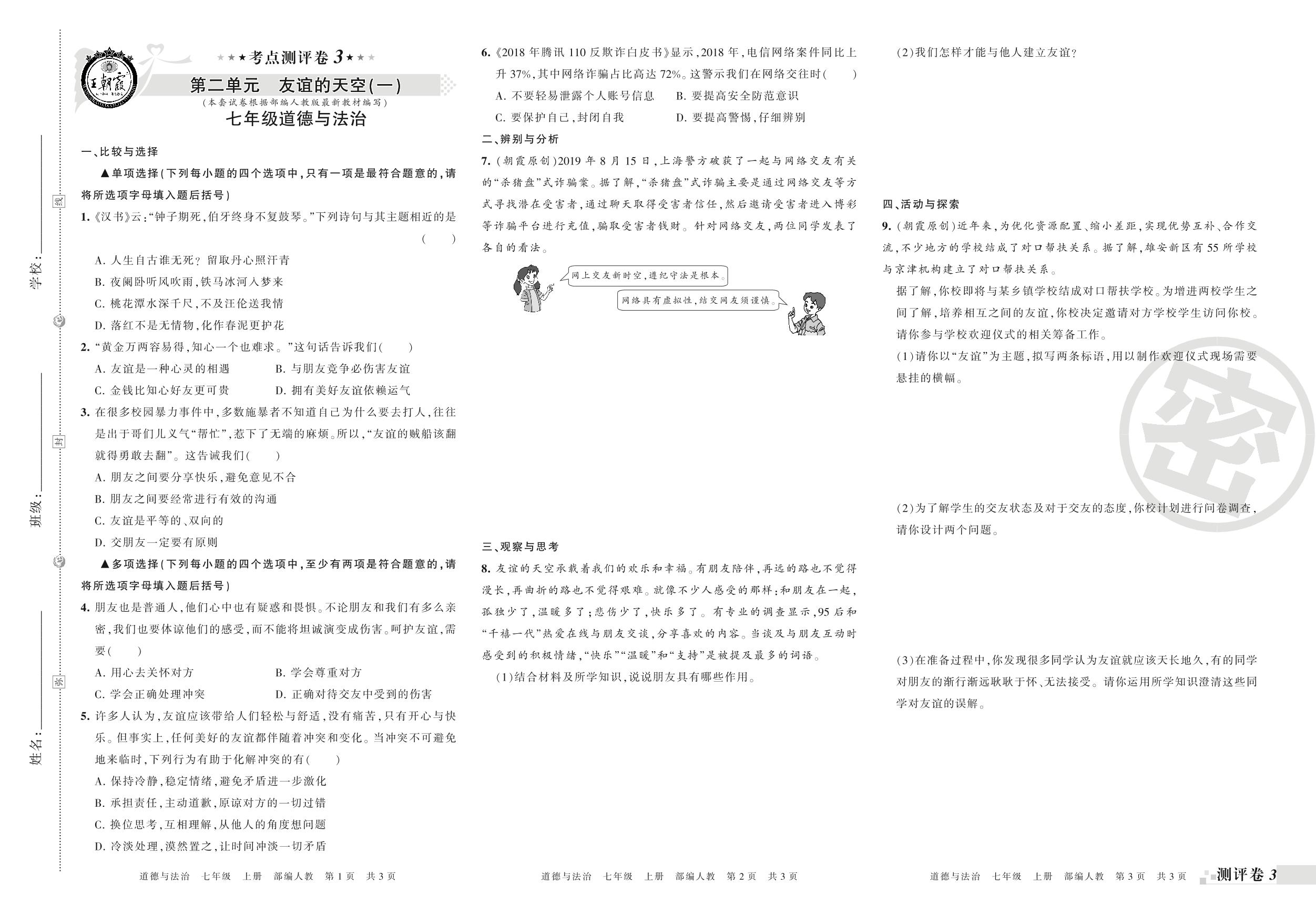 王朝霞期末测评卷——第二单元 友谊的天空七年级上册道德与法治(人教版)【0】