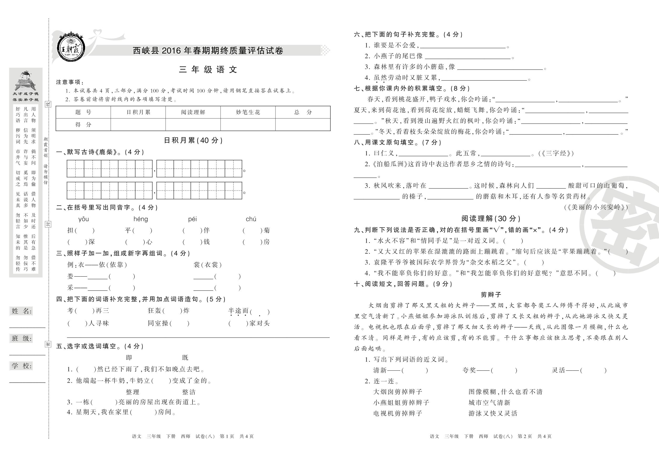 2015-2016学年第二学期南阳市西峡县三年级语文试卷(西师版)【8】