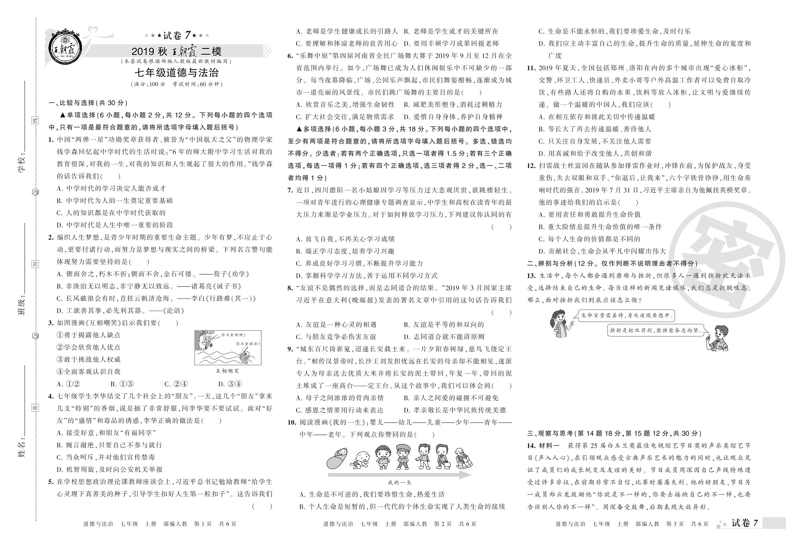 王朝霞期末模拟卷七年级上册道德与法治(人教版)_R210812144231【7】
