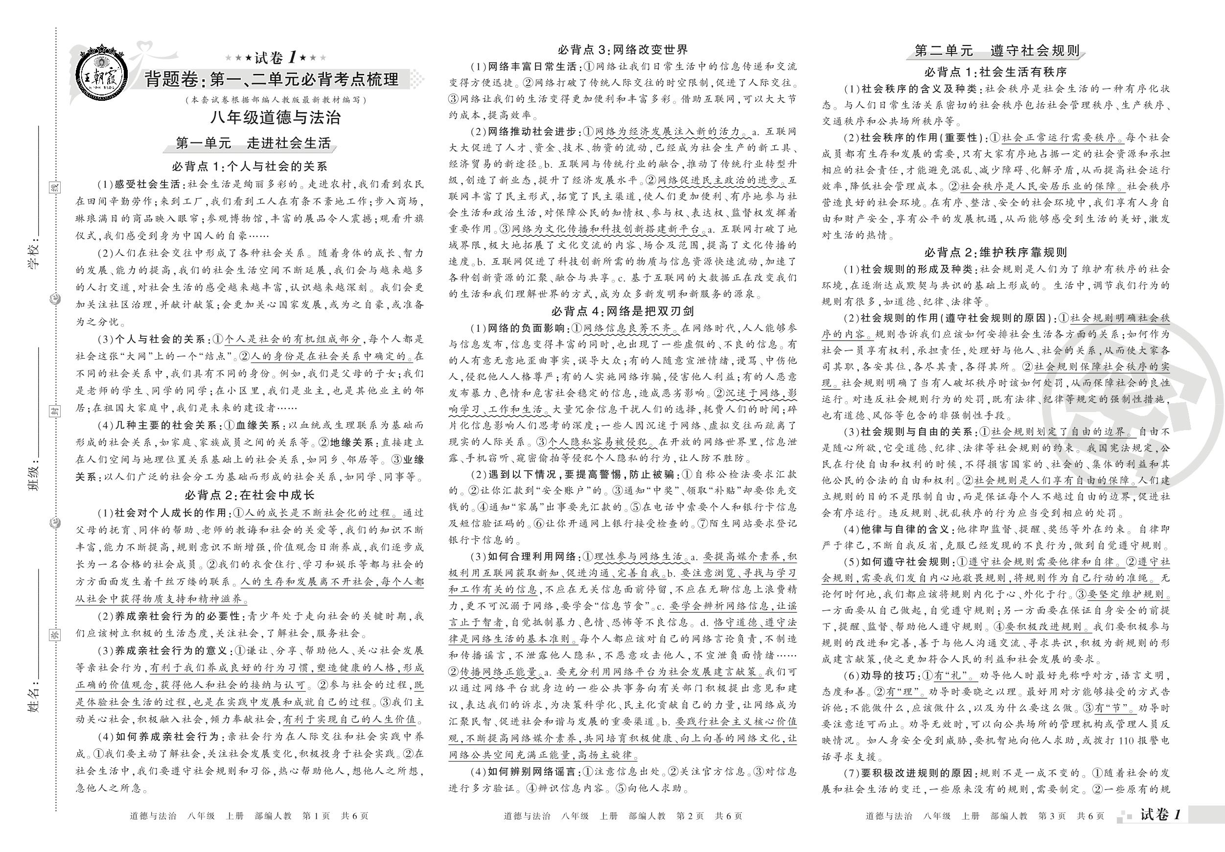 王朝霞期末背题卷——第一、二单元必背考点梳理八年级上册道德与法治(人教版)【1】