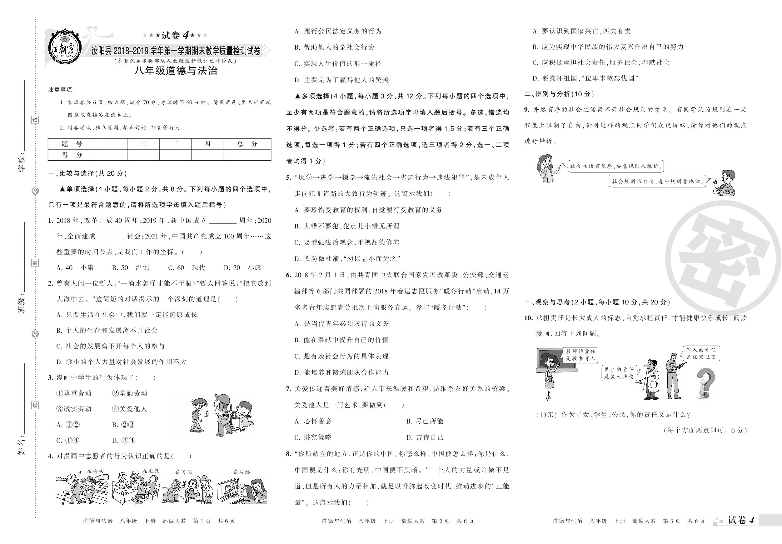 2018-2019学年第一学期洛阳市汝阳县八年级道德与法治试卷(人教版)【4】
