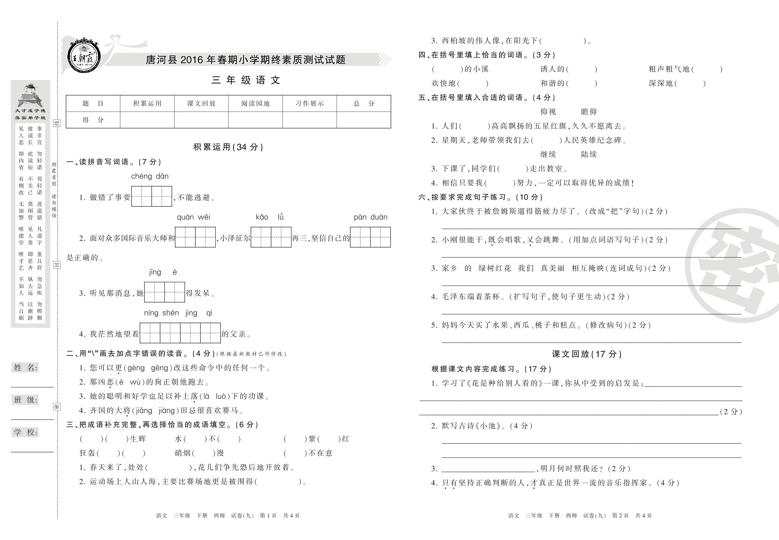 2015-2016学年第二学期南阳市唐河县三年级语文试卷(西师版)【9】