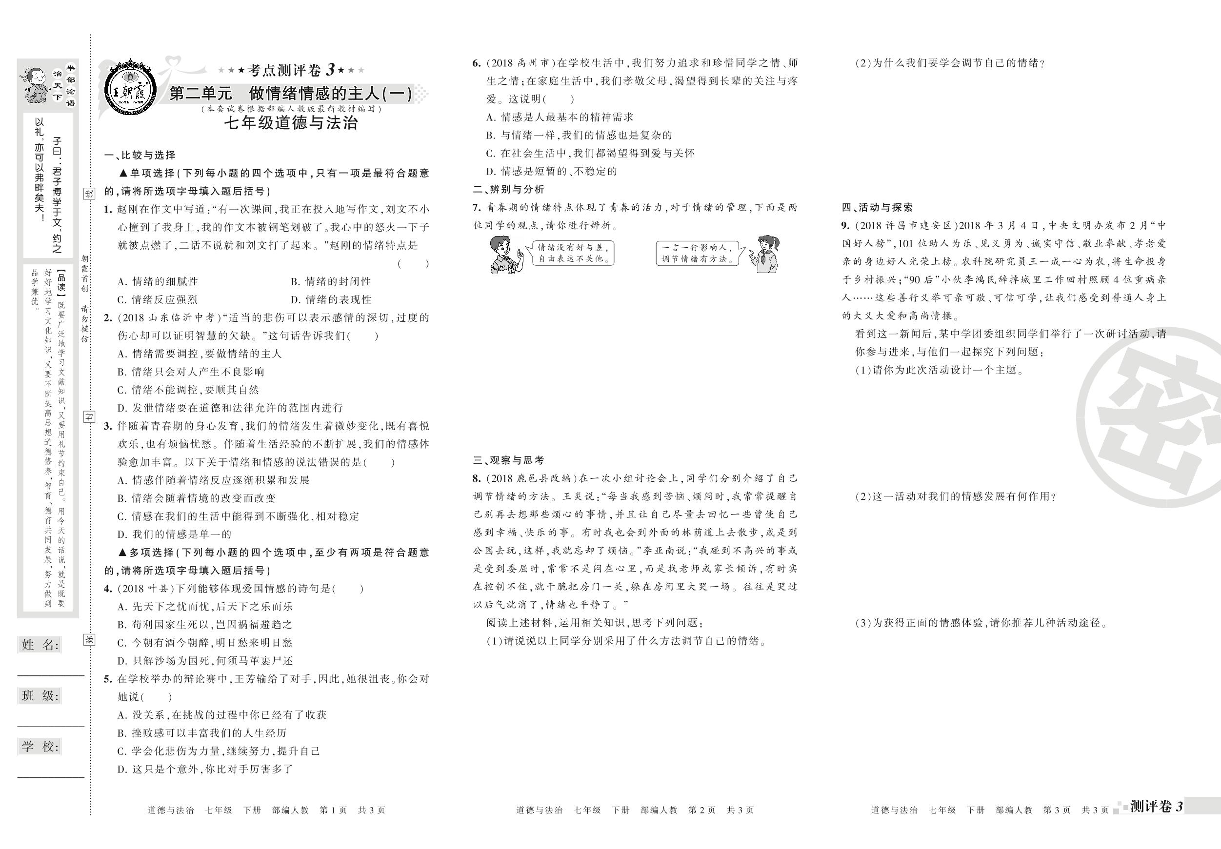 王朝霞期末测评卷——第二单元 做情绪情感的主人(一)、做情绪情感的主人(二)七年级下册道德与法治(人教版)【0】