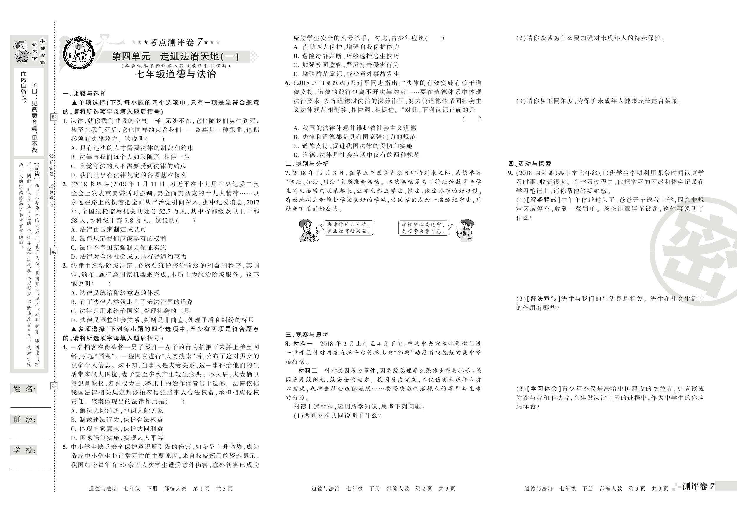 王朝霞期末测评卷——第四单元 走进法治天地(一)、走进法治天地(二)七年级下册道德与法治(人教版)【0】