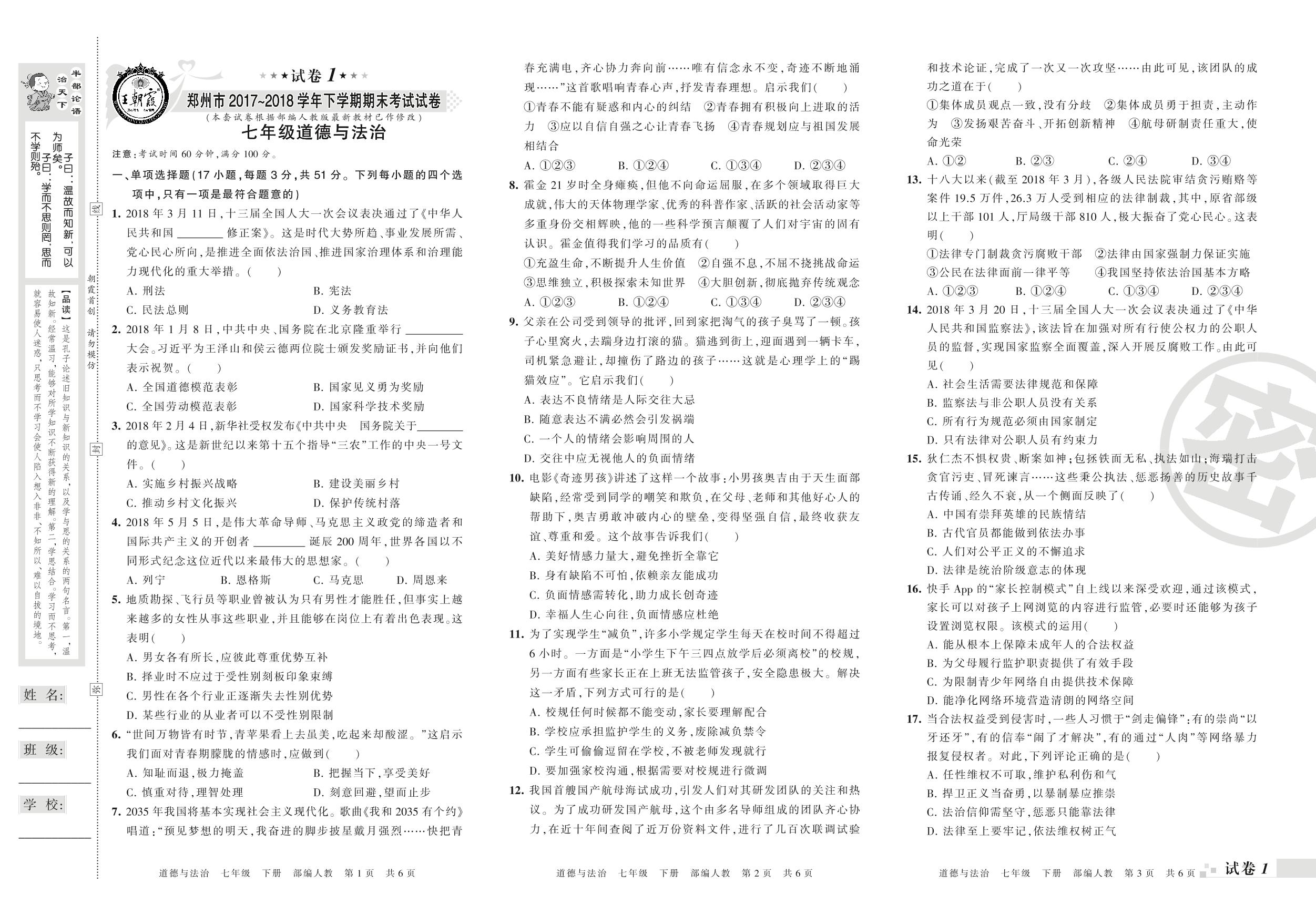 2017-2018学年第二学期郑州市七年级道德与法治试卷(人教版)【1】