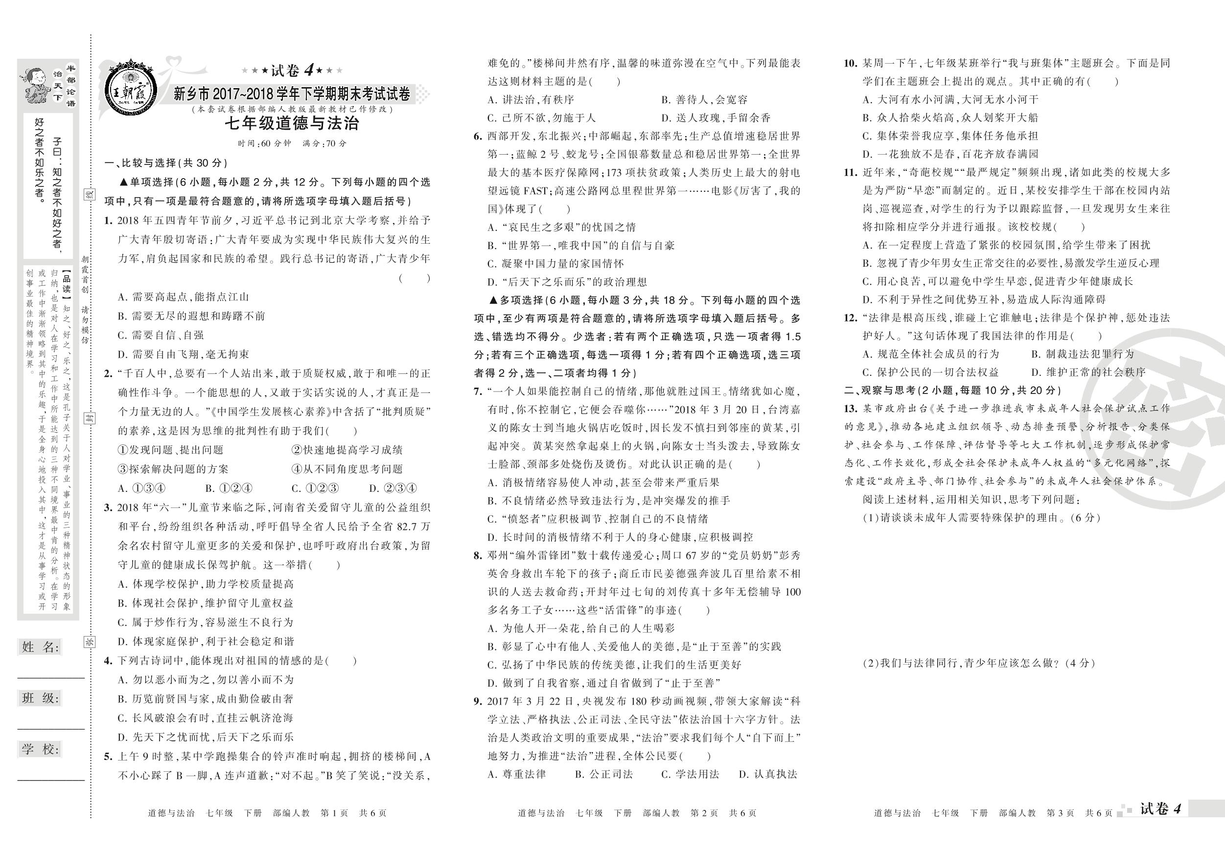 2017-2018学年第二学期新乡市七年级道德与法治试卷(人教版)【4】