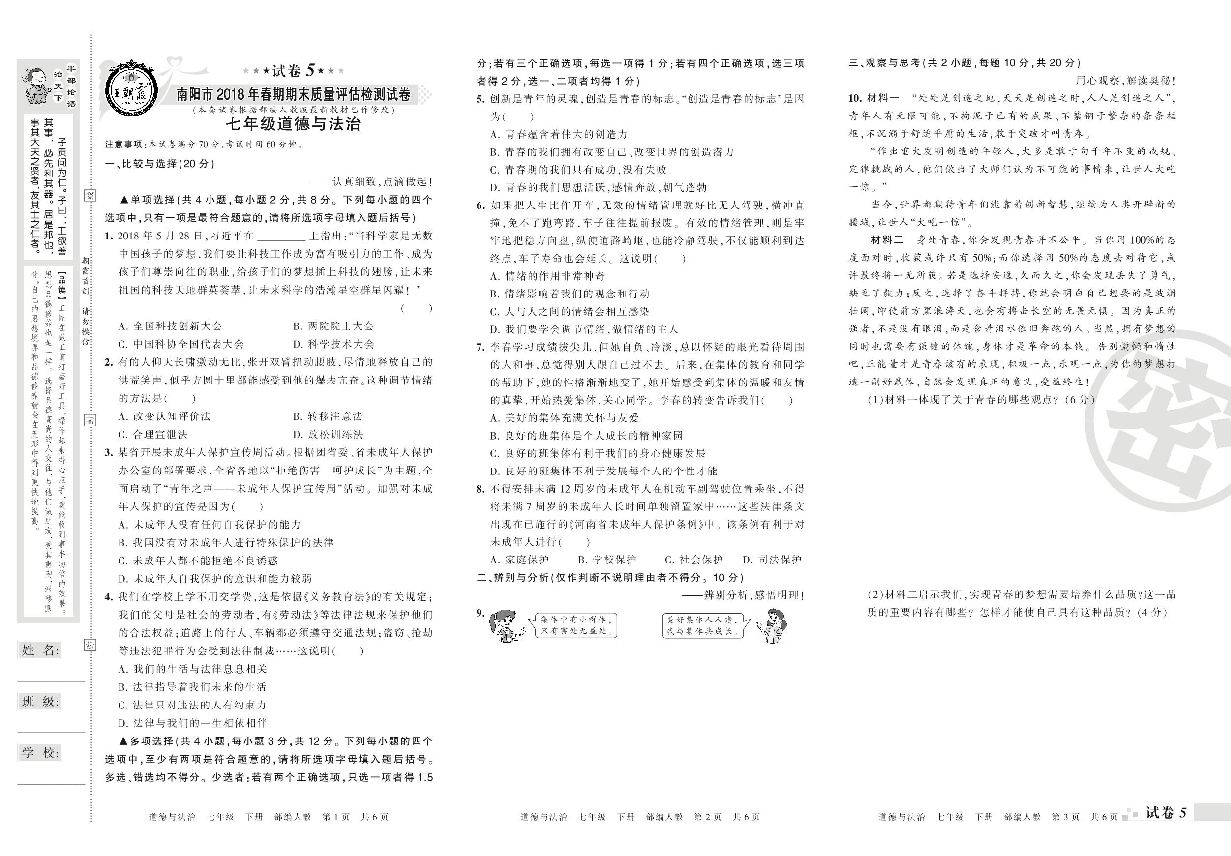 2017-2018学年第二学期南阳市七年级道德与法治试卷(人教版)【5】