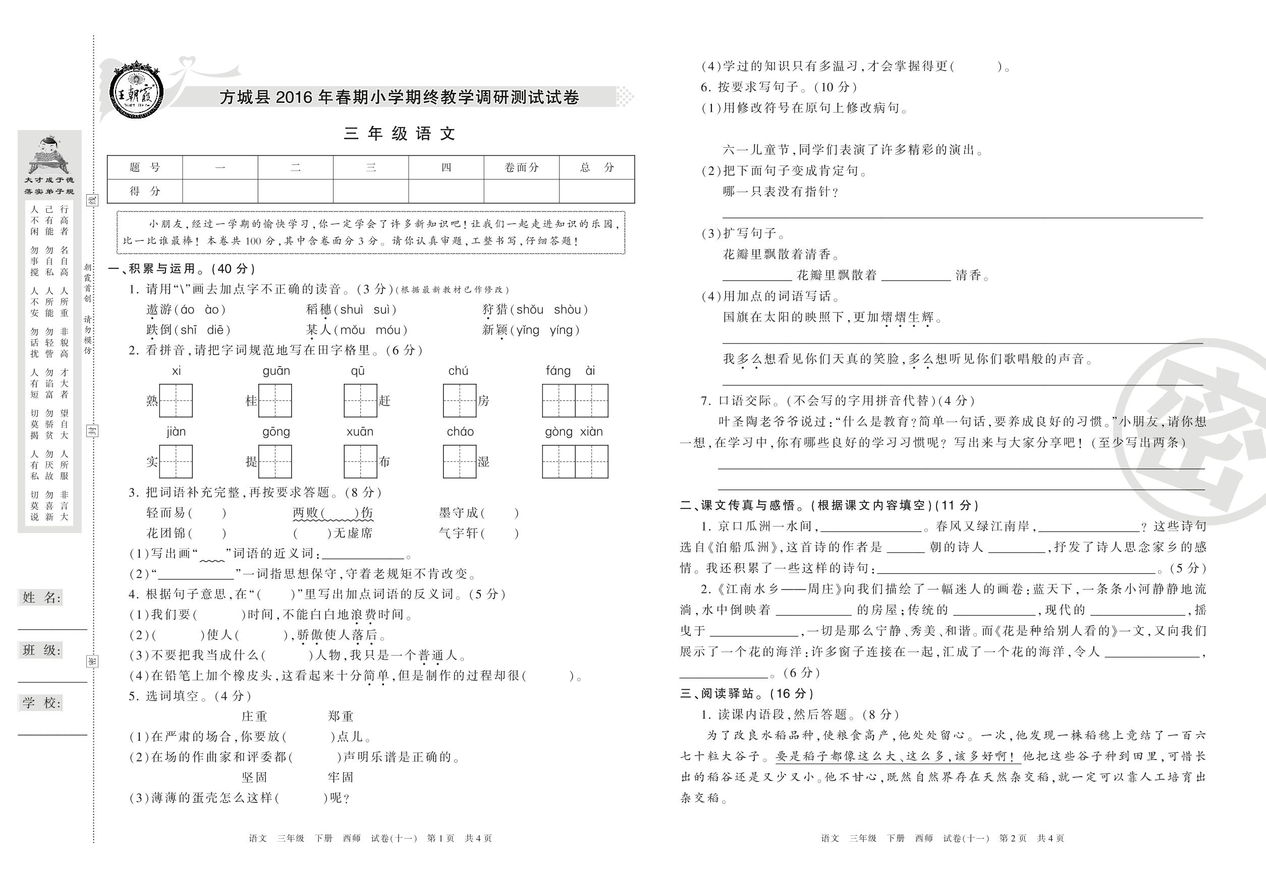 2015-2016学年第二学期南阳市方城县三年级语文试卷(西师版)【11】