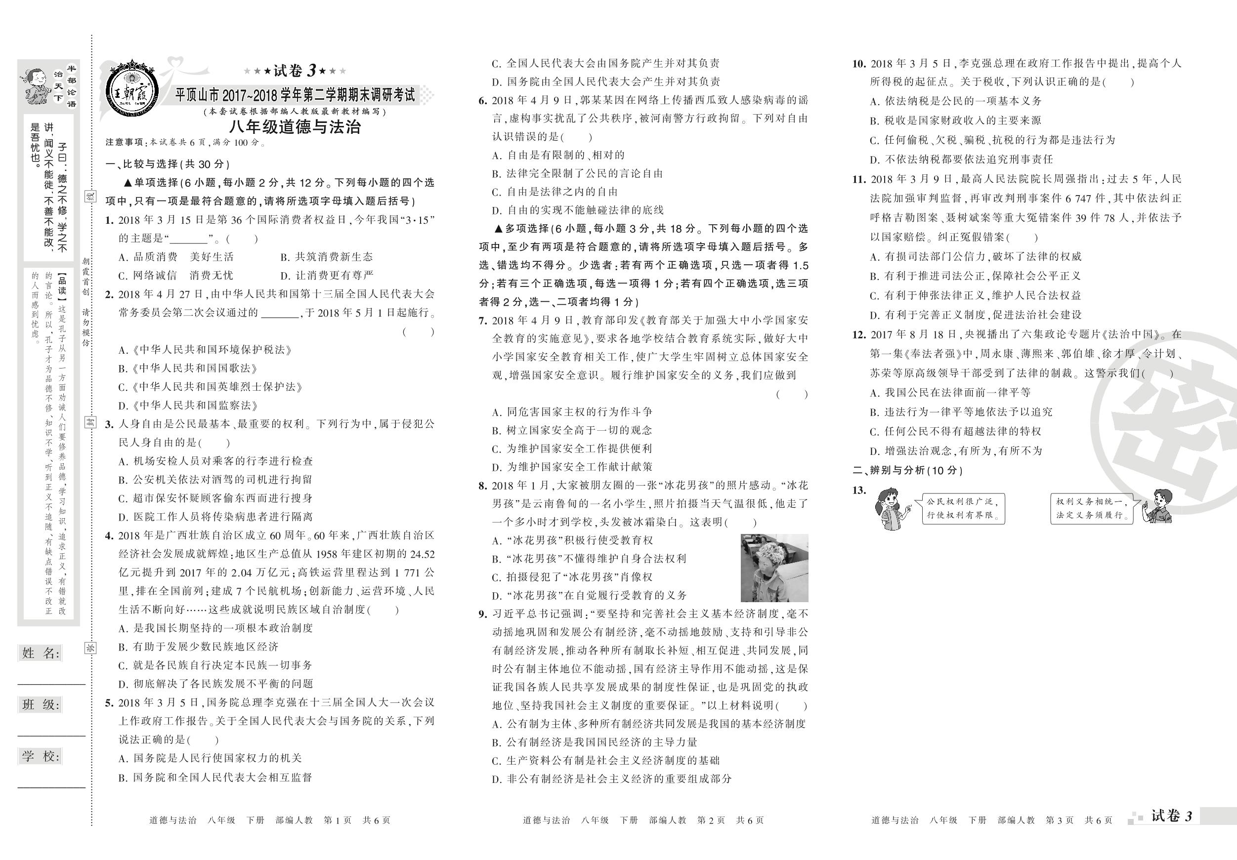 2017-2018学年第二学期平顶山市八年级道德与法治试卷(人教版)【3】