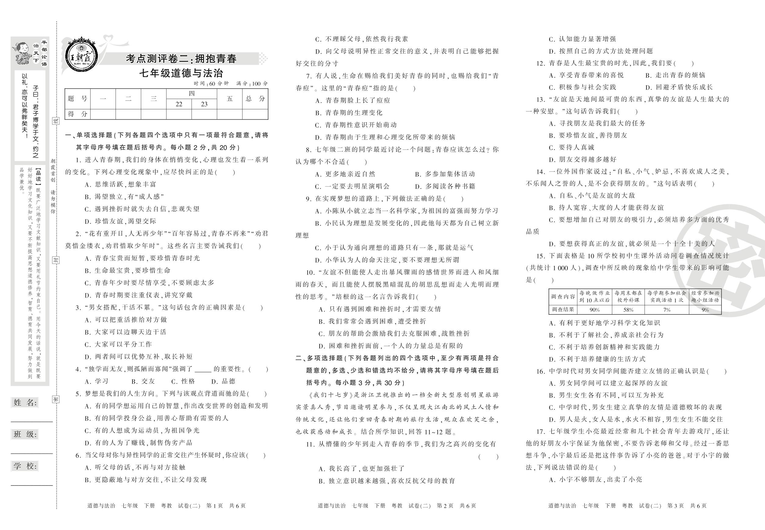 七年级道德与法治粤教版下册单元卷