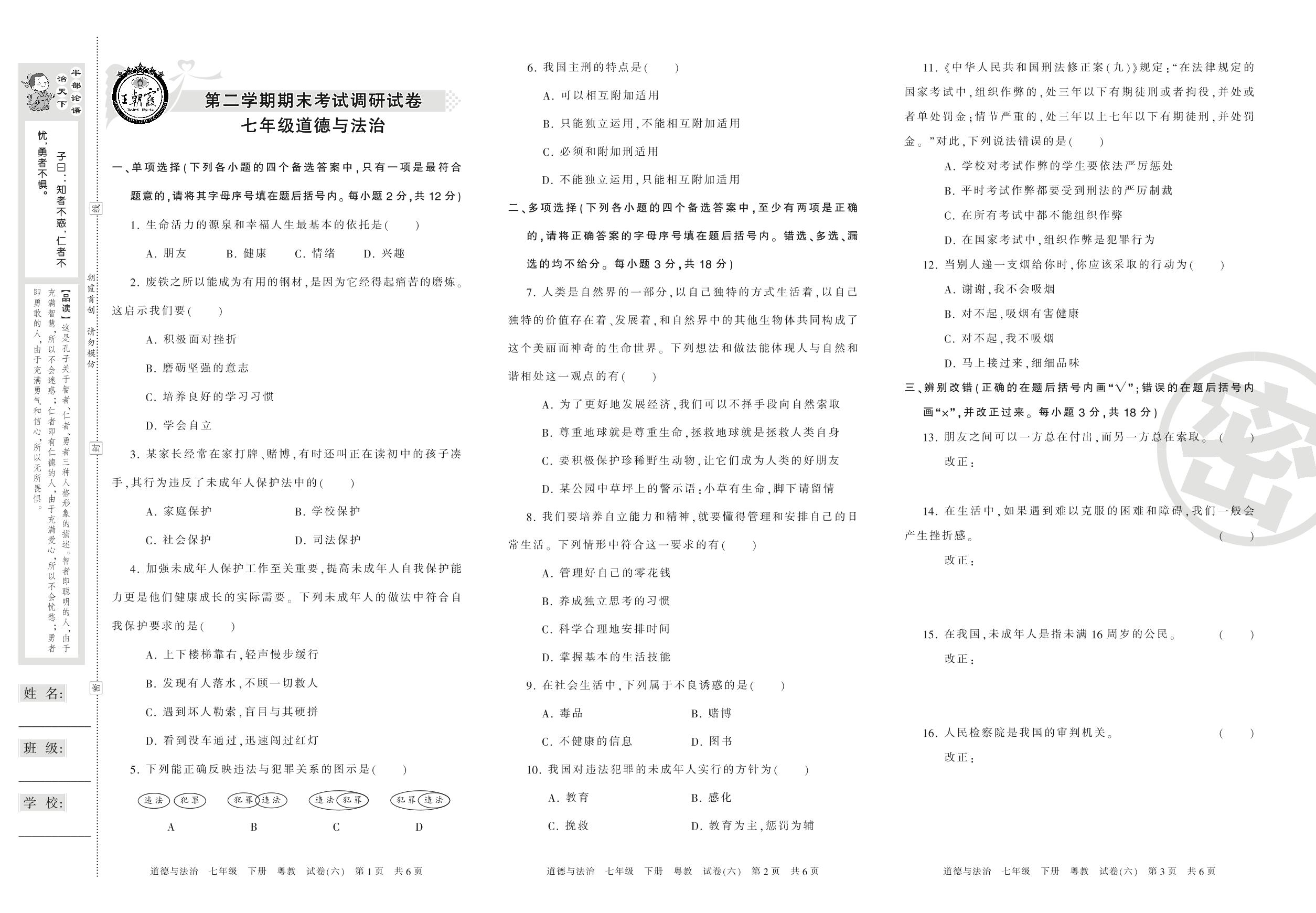 王朝霞期末调研卷七年级下册道德与法治(粤教版)【6】