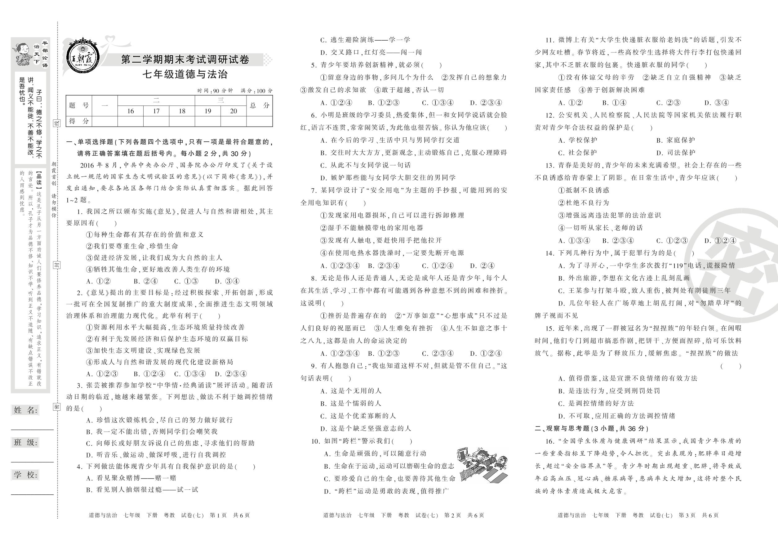 王朝霞期末调研卷七年级下册道德与法治(粤教版)【7】