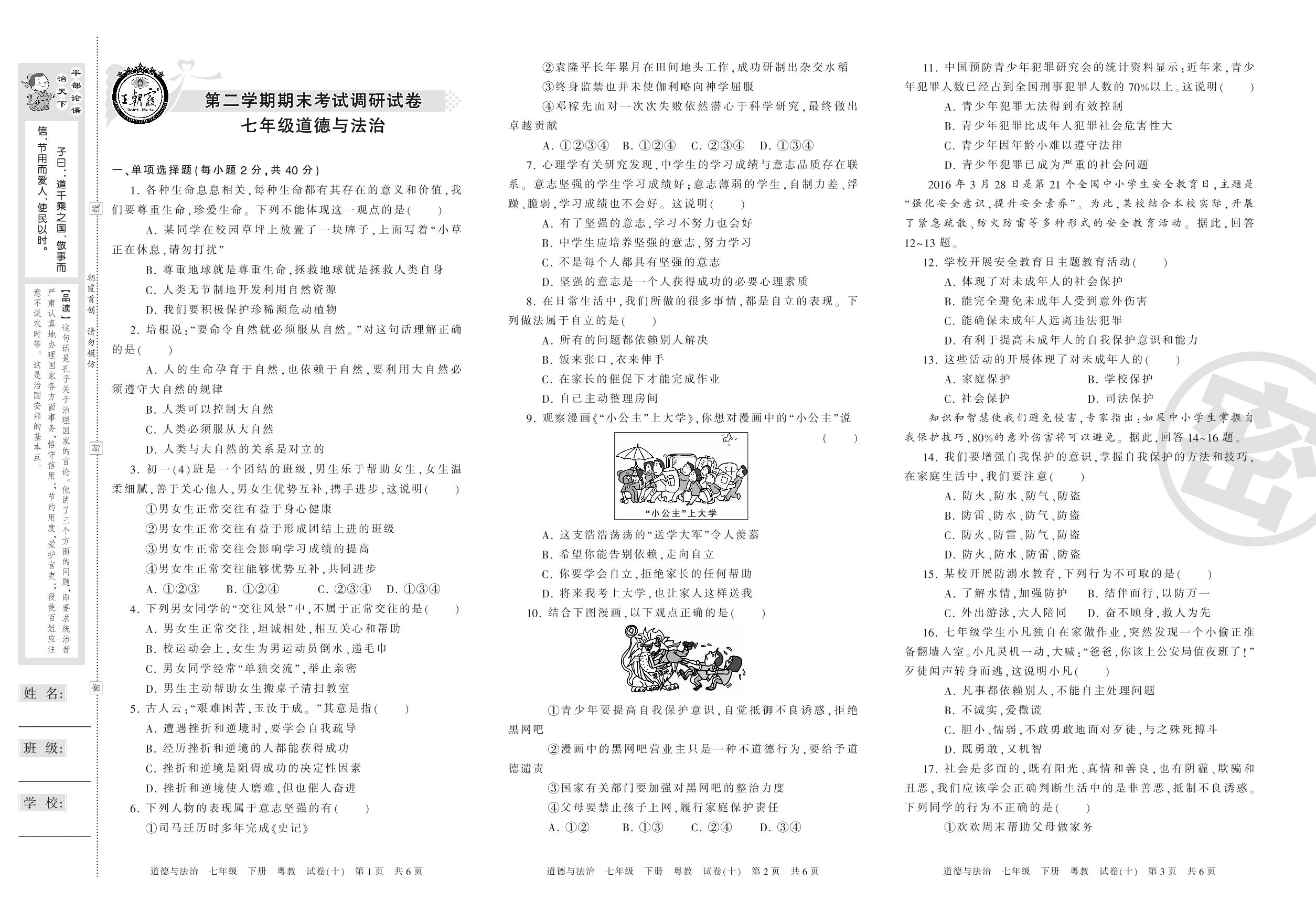 王朝霞期末调研卷七年级下册道德与法治(粤教版)【10】