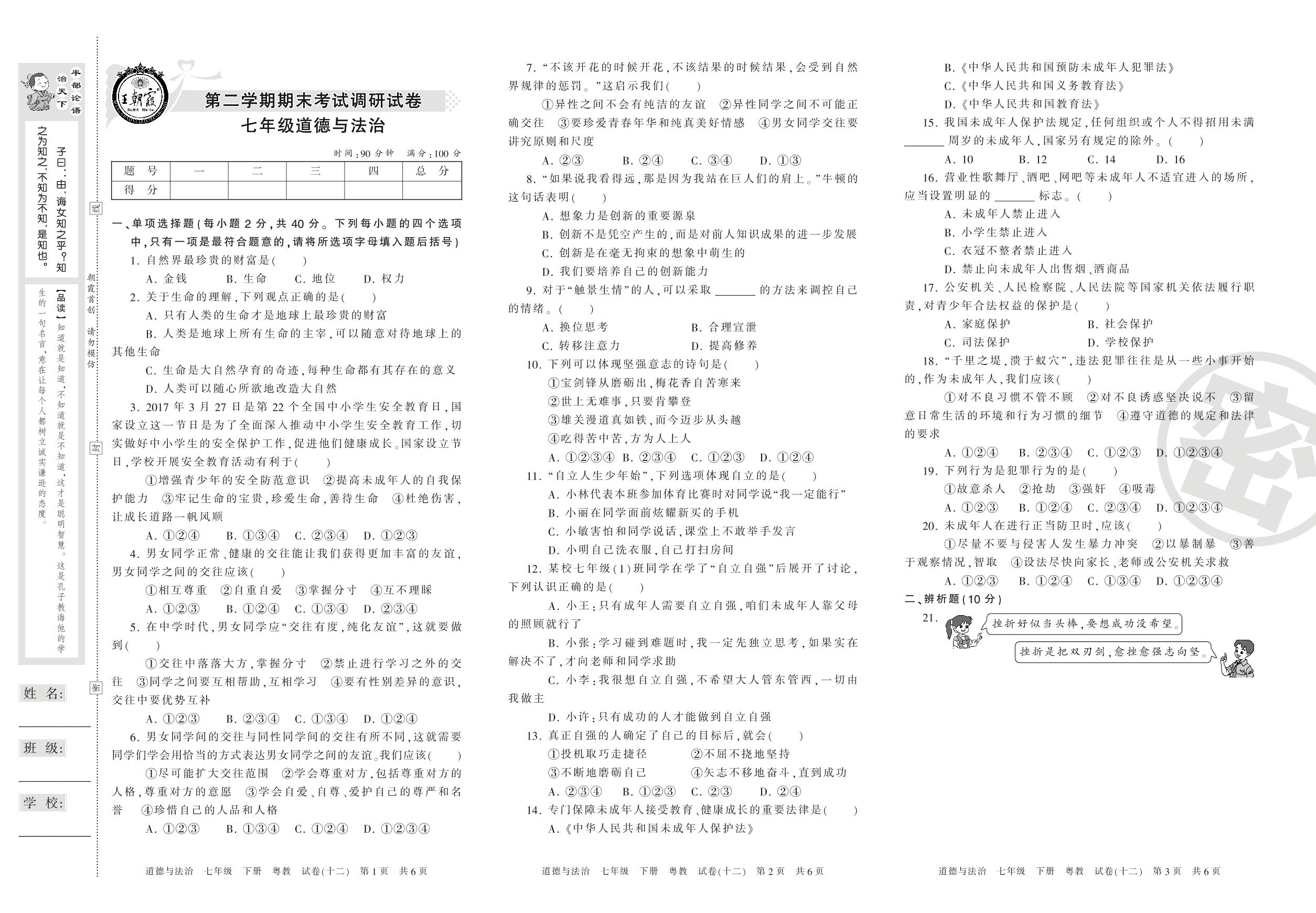 王朝霞期末调研卷七年级下册道德与法治(粤教版)【12】