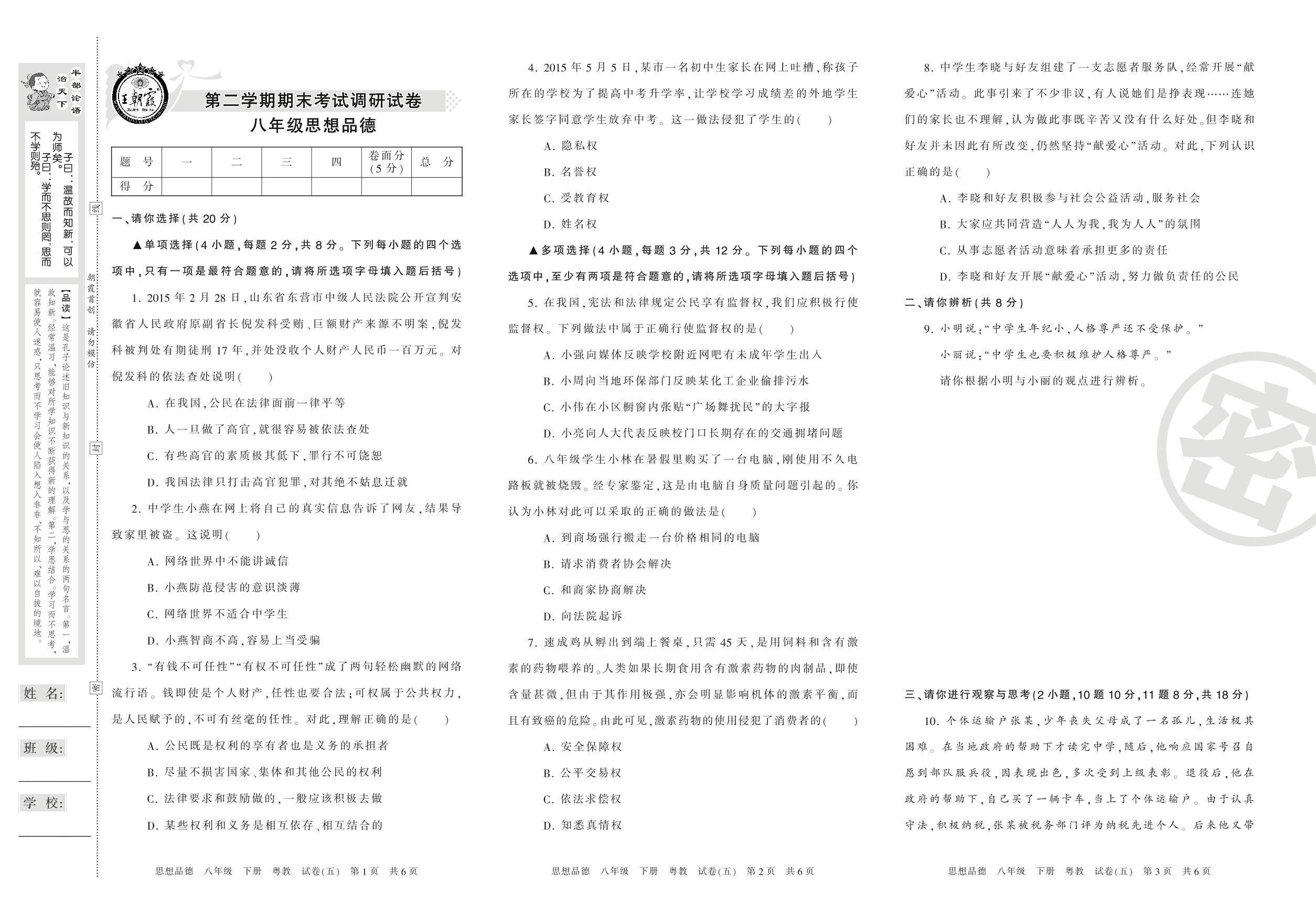 王朝霞期末调研卷八年级下册道德与法治(粤教版)【5】