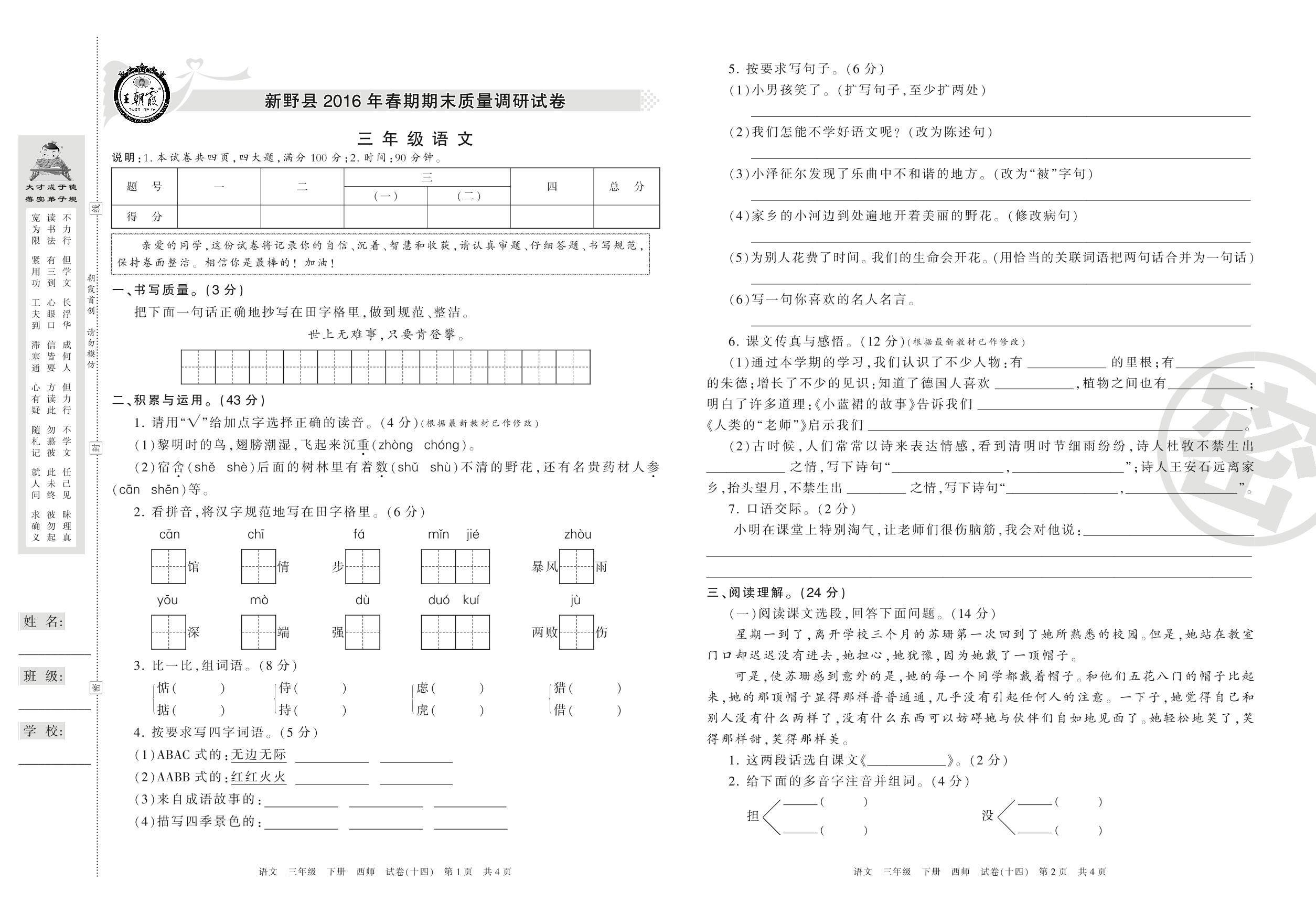 2015-2016学年第二学期南阳市新野县三年级语文试卷(西师版)【14】