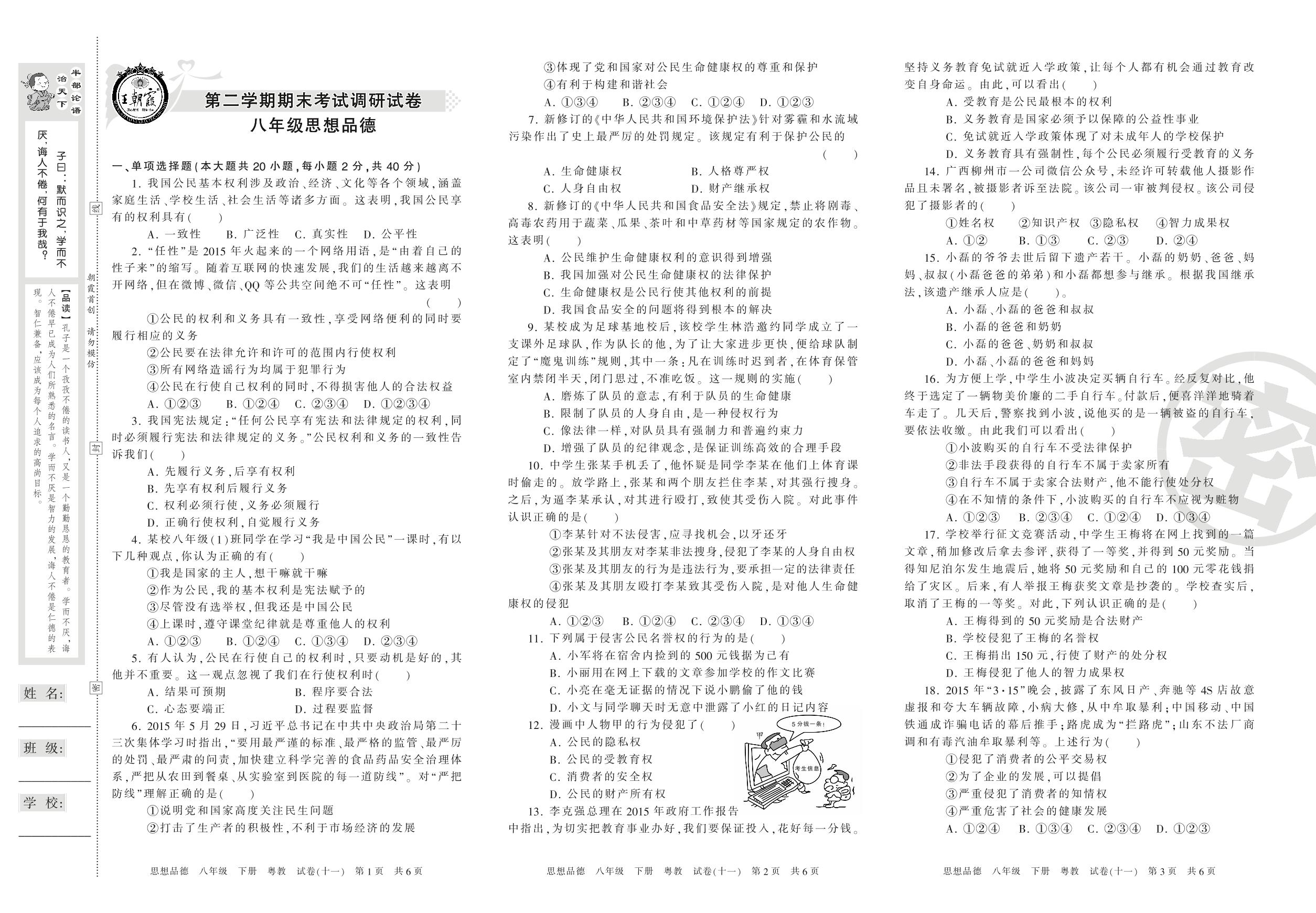 王朝霞期末调研卷八年级下册道德与法治(粤教版)【11】