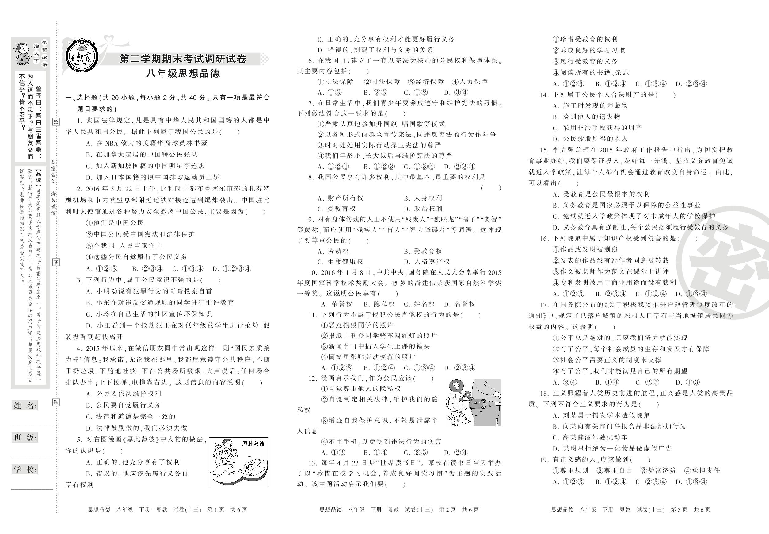 王朝霞期末调研卷八年级下册道德与法治(粤教版)【13】