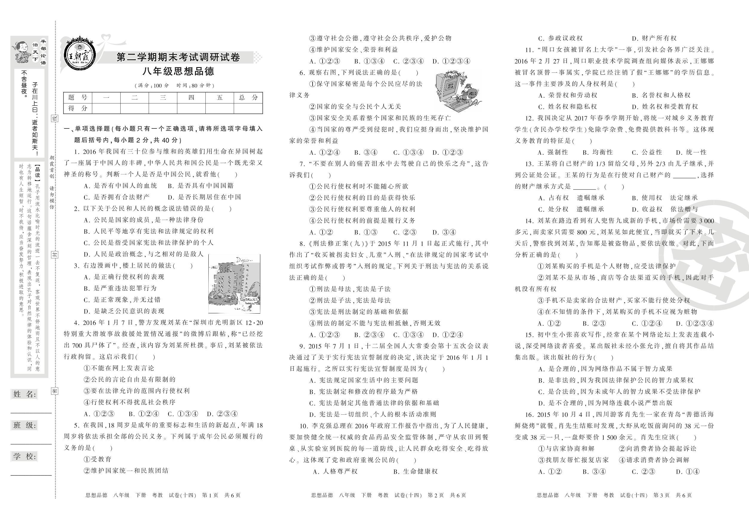 王朝霞期末调研卷八年级下册道德与法治(粤教版)【14】