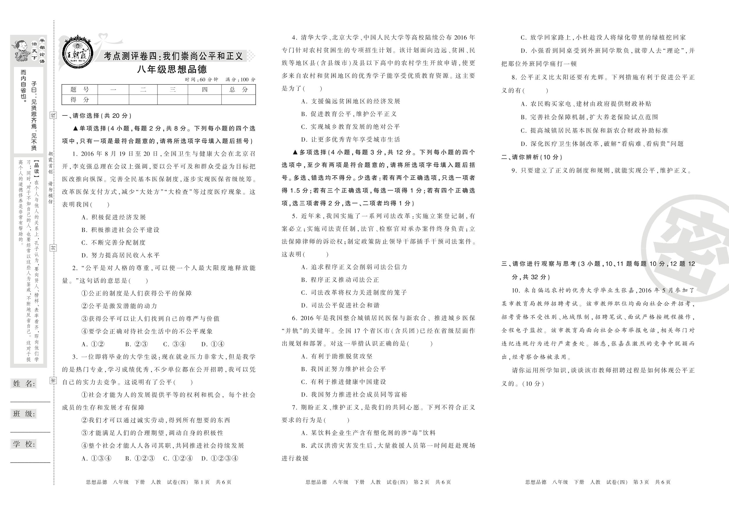 八年级道德与法治人教版下册单元卷