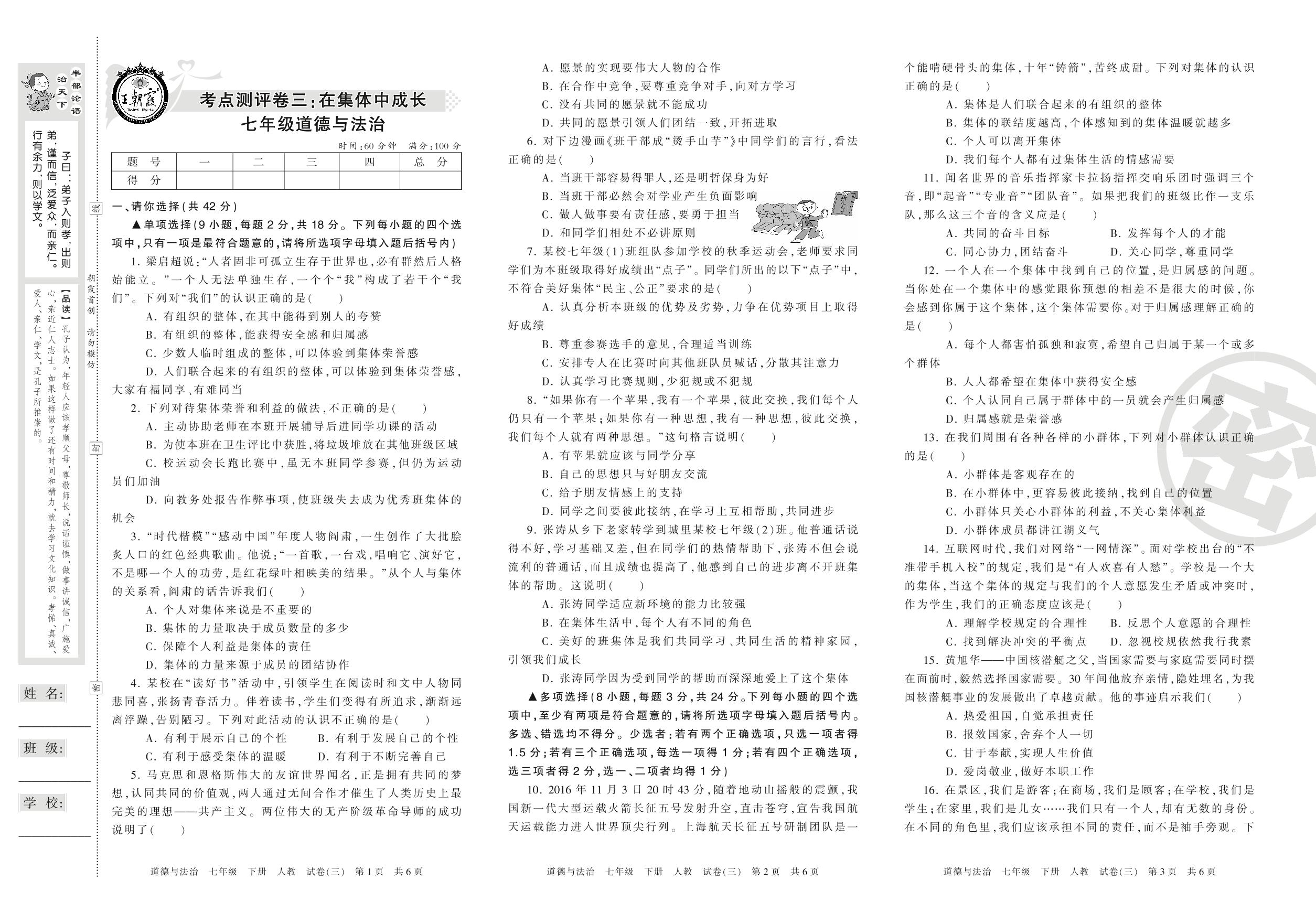 王朝霞期末专项卷七年级下册道德与法治(人教版)【3】