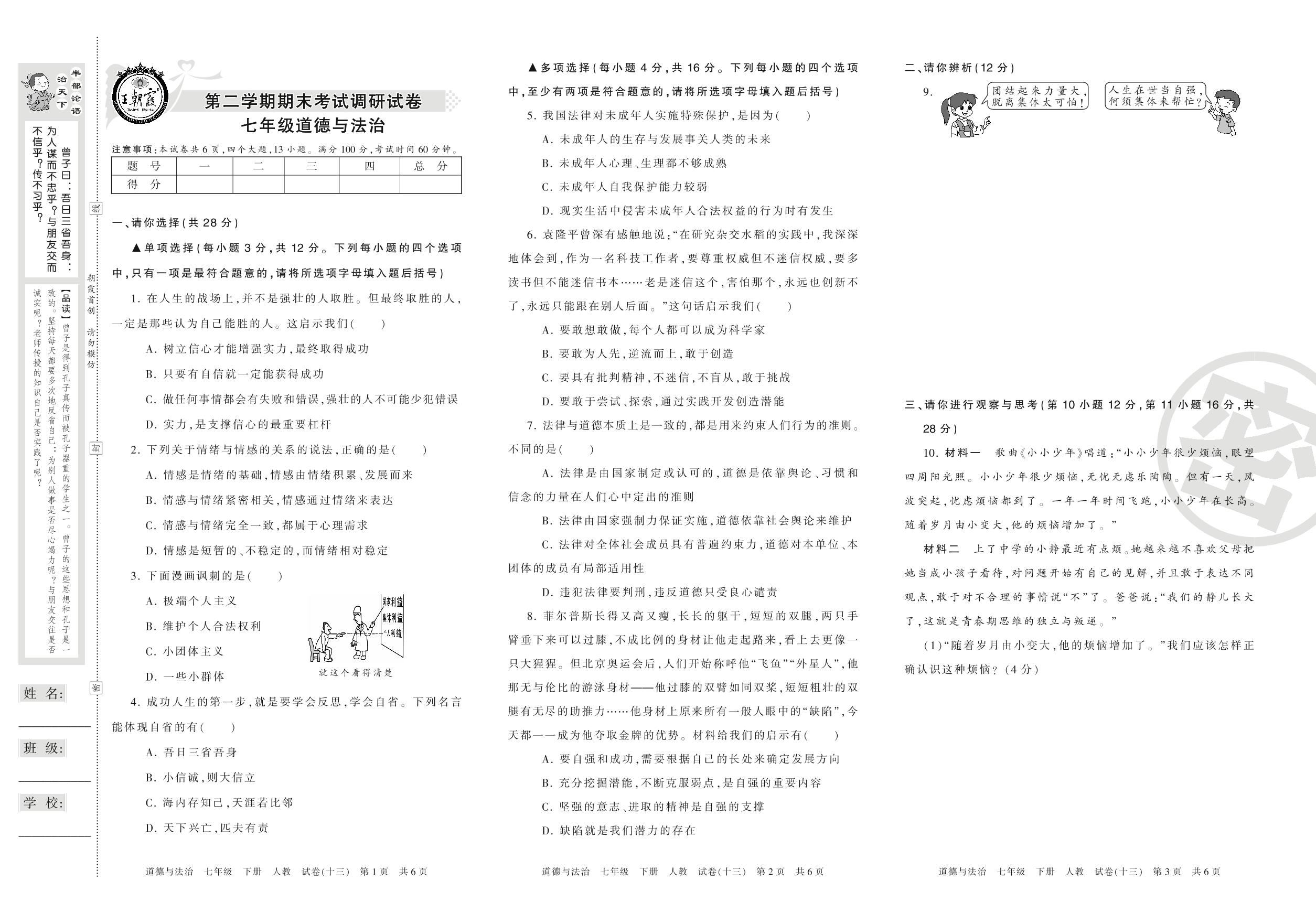 七年级道德与法治人教版下册期末卷