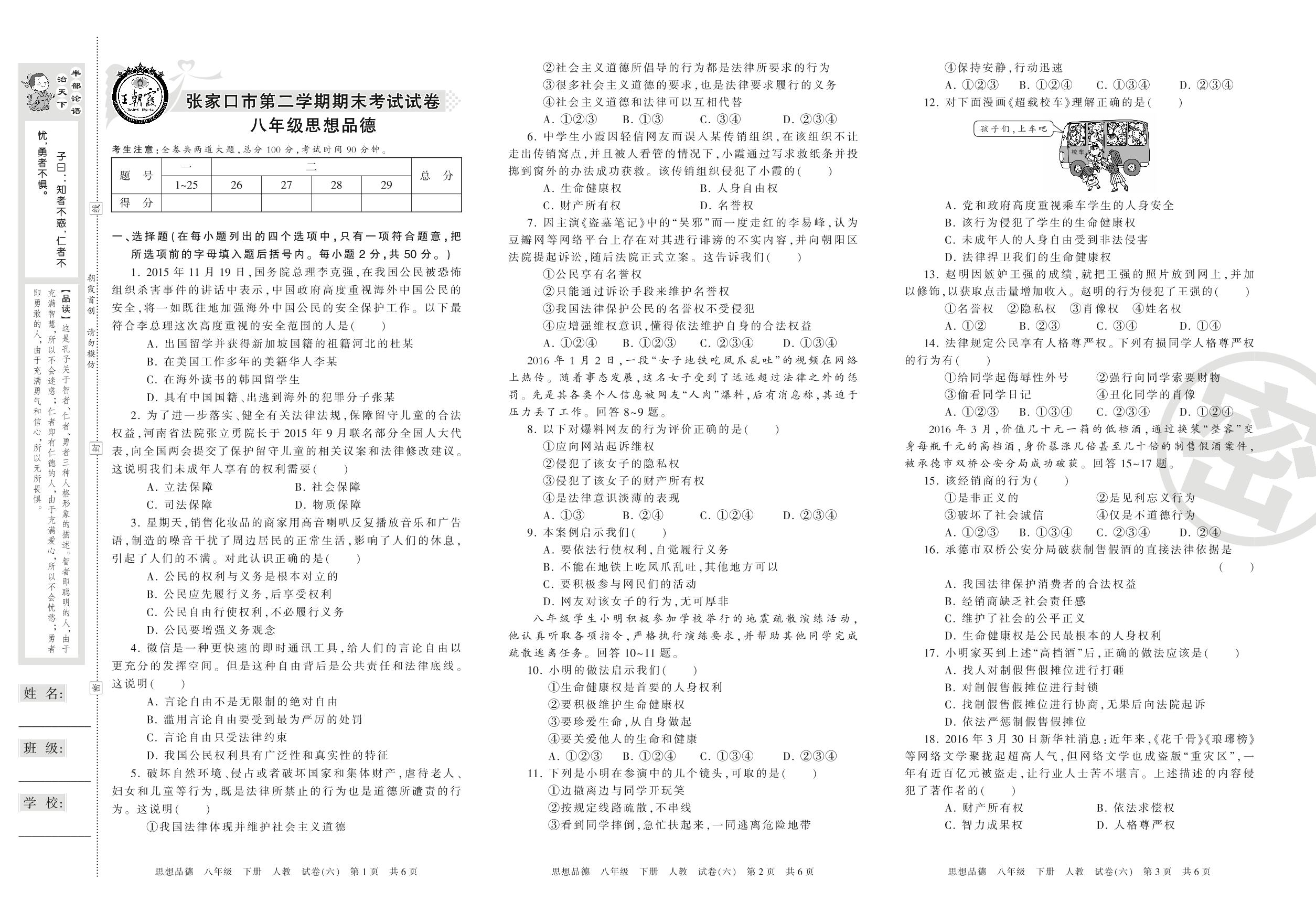 2015-2016学年第二学期张家口市八年级道德与法治试卷(人教版)【6】