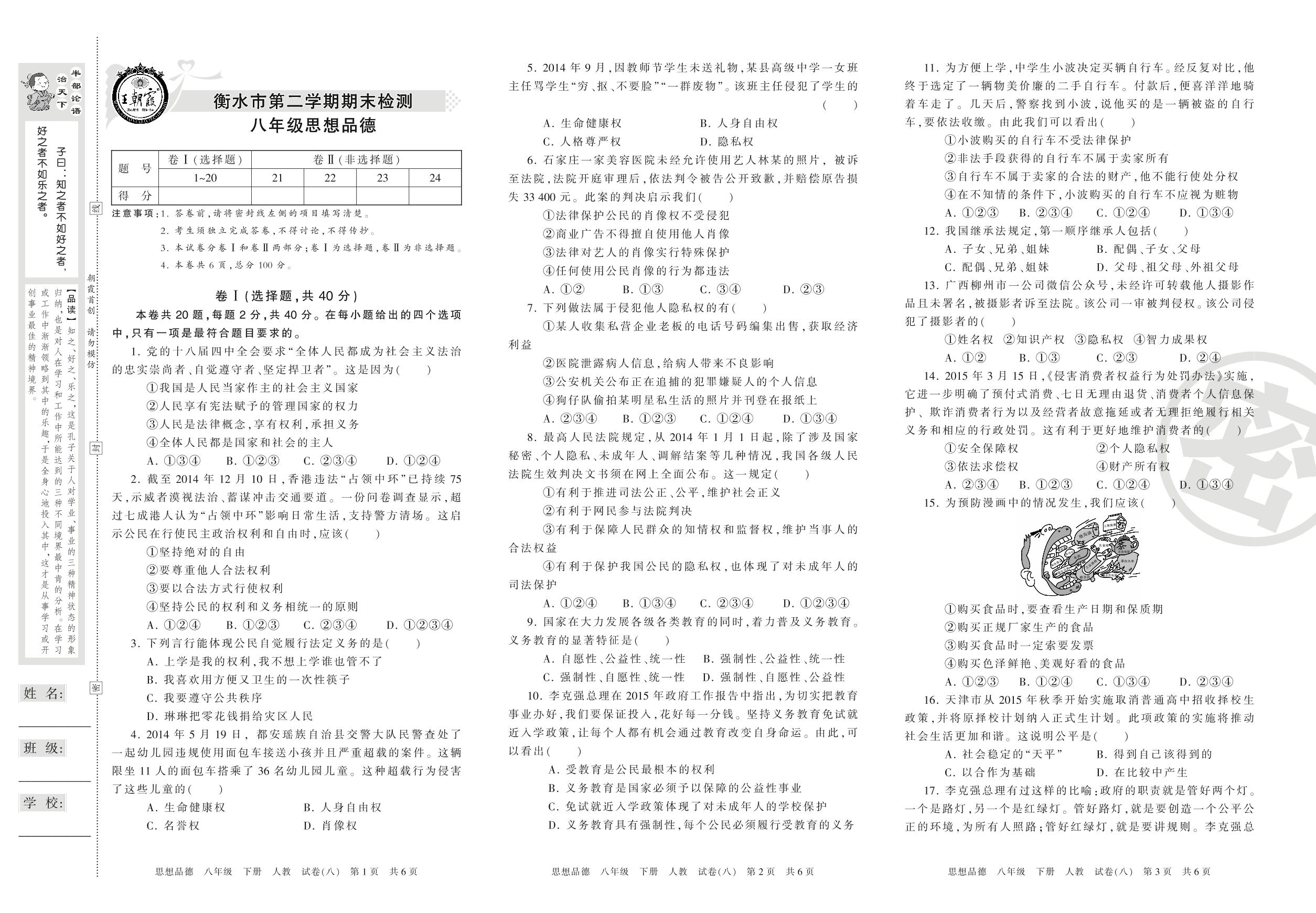 2015-2016学年第二学期衡水市八年级道德与法治试卷(人教版)【8】