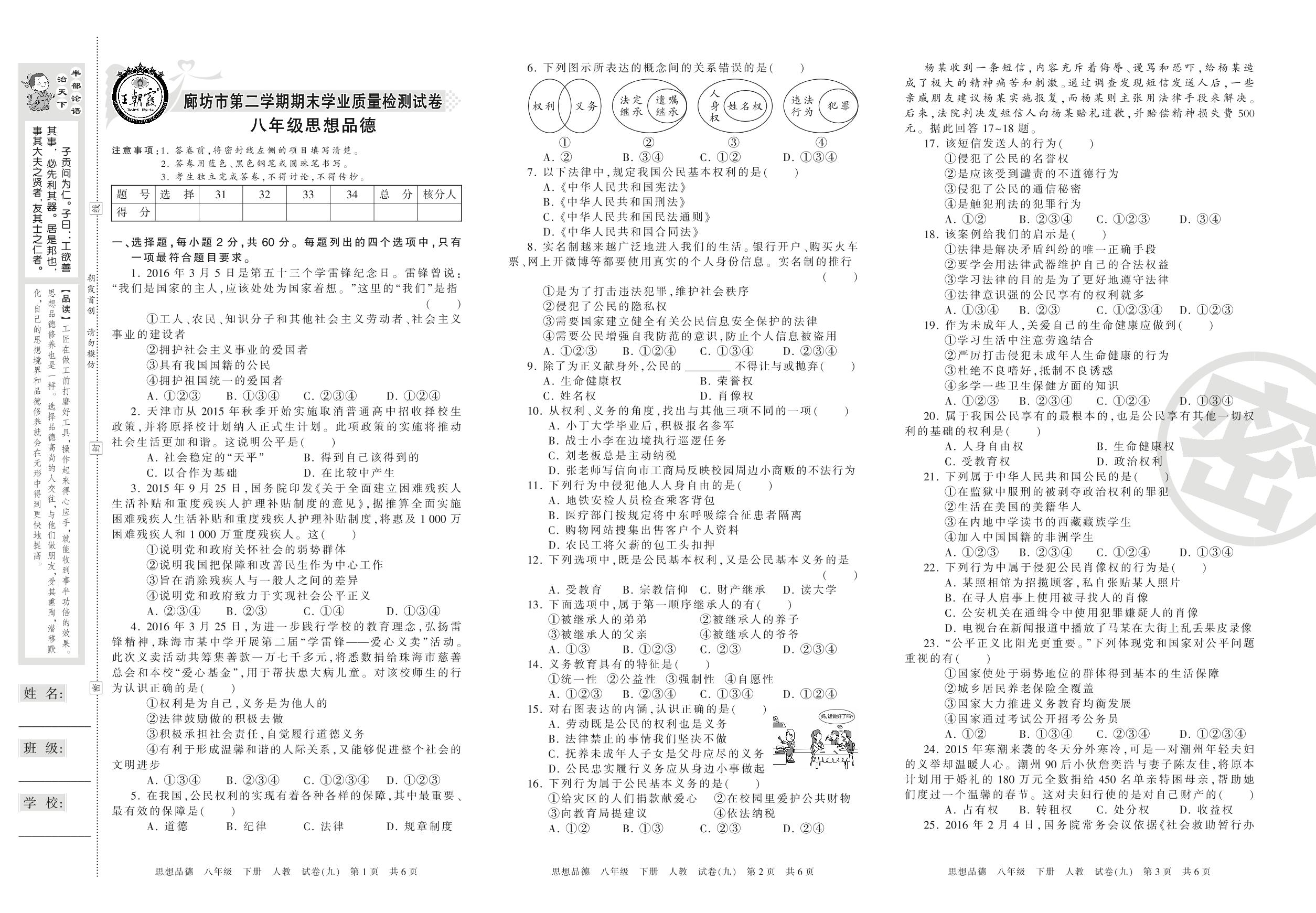 2015-2016学年第二学期廊坊市八年级道德与法治试卷(人教版)【9】