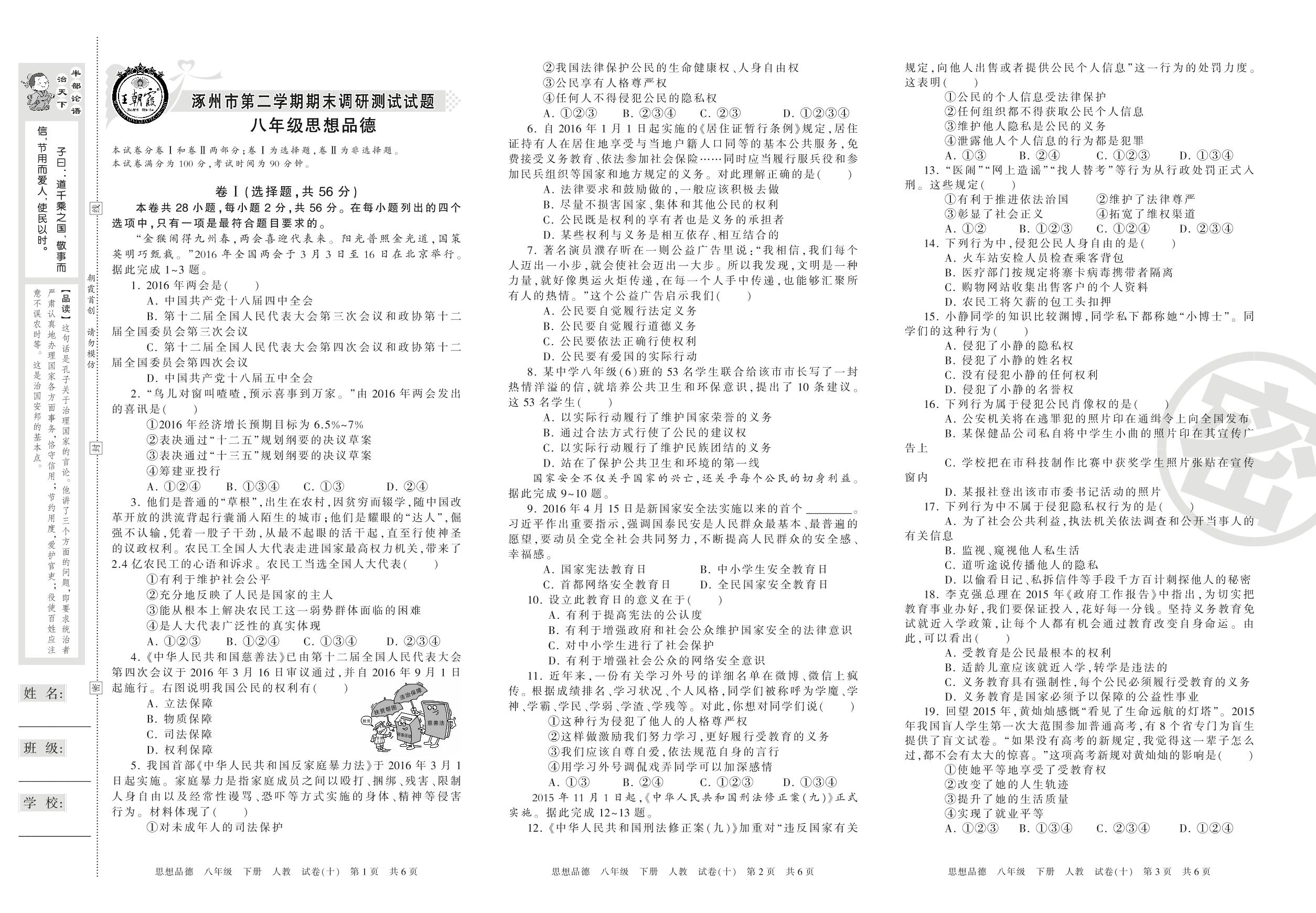 2015-2016学年第二学期涿州市八年级道德与法治试卷(人教版)【10】