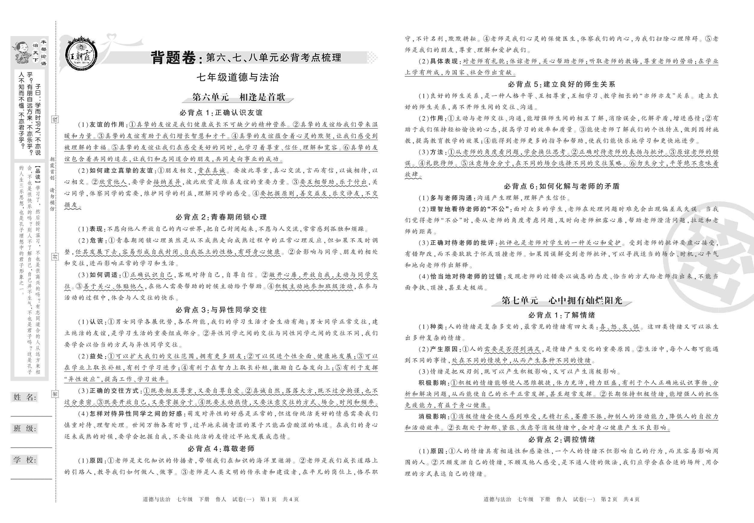 王朝霞期末背题卷——第六、七、八单元必背考点梳理七年级下册道德与法治(鲁人版)【1】