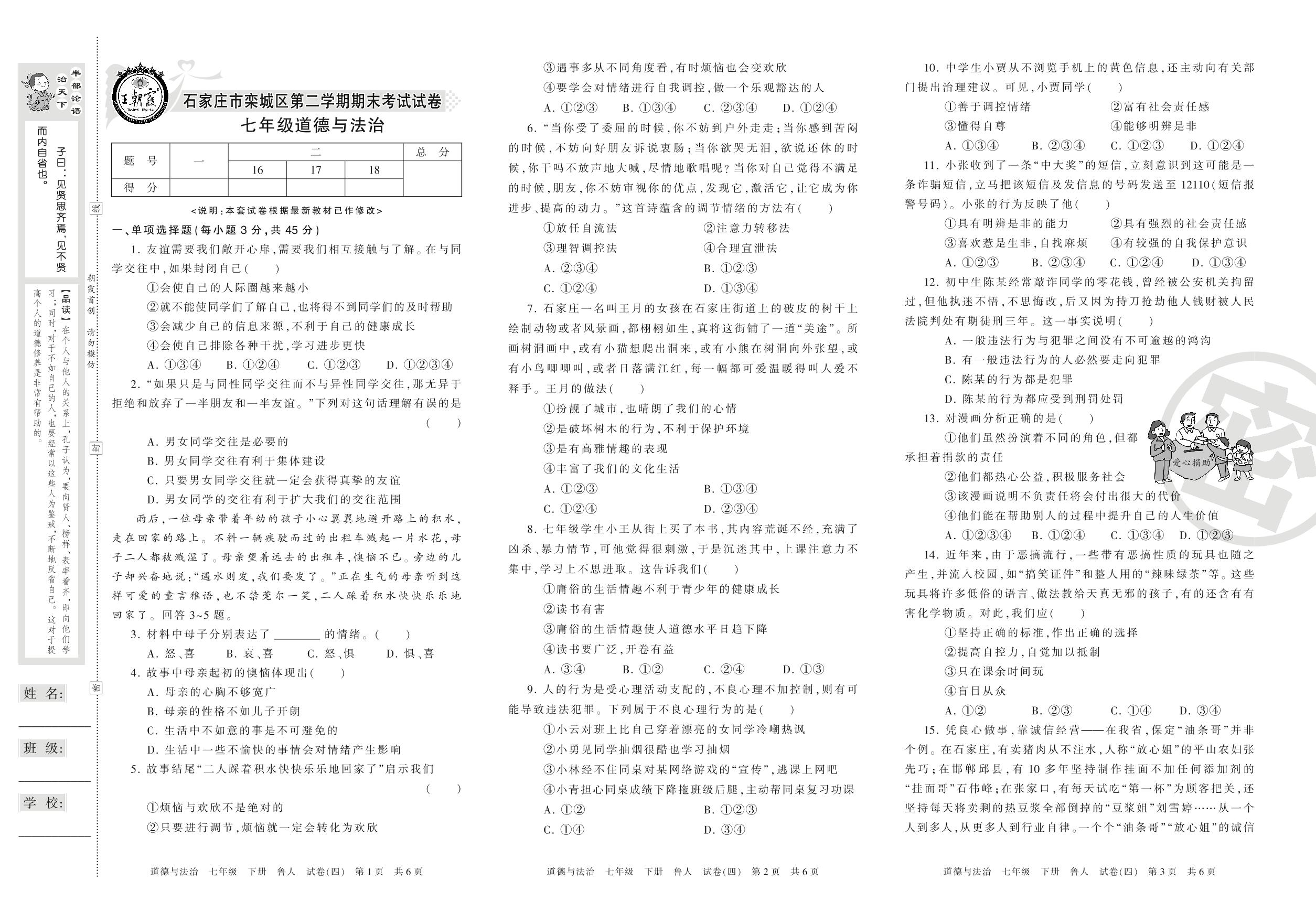 七年级道德与法治鲁人版下册期末卷