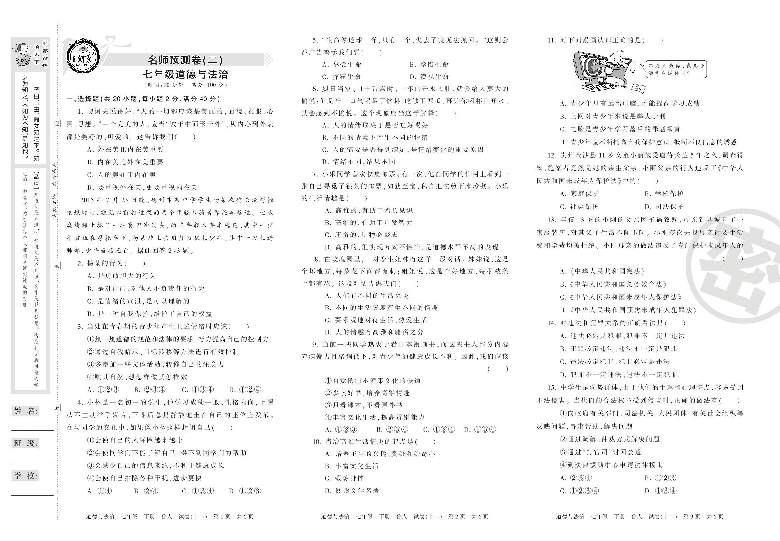 王朝霞名师期末预测卷七年级下册道德与法治(鲁人版)【12】